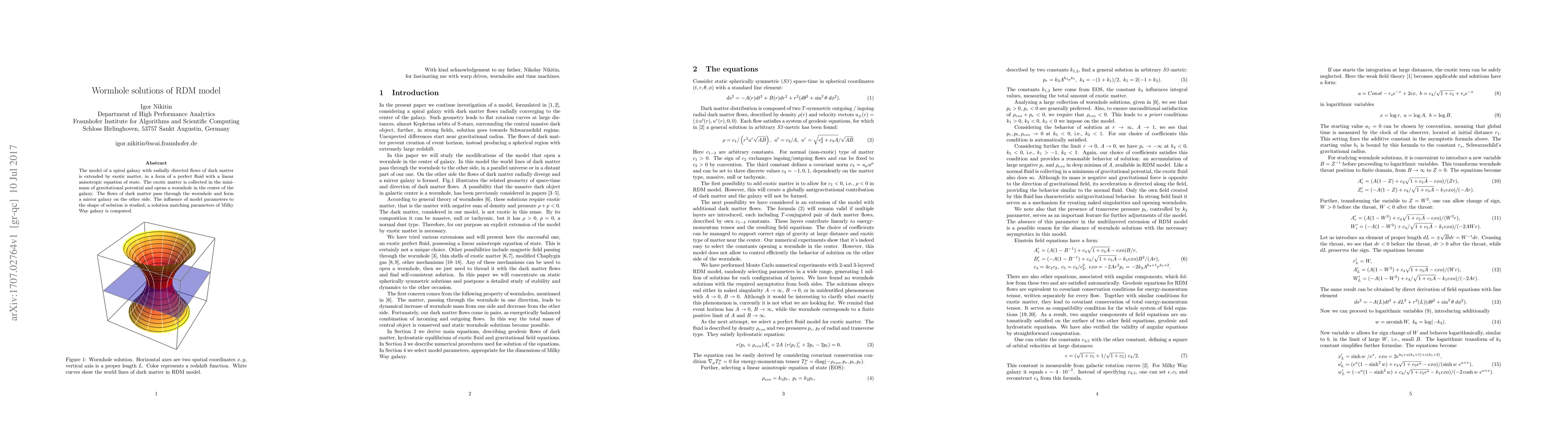 The model of a spiral galaxy with radially directed flows of dark matter is extended by exotic matter, in a form of a perfect fluid with a linear anisotropic equation of state. The exotic matter is collected in the minimum of gravitational potential and opens a wormhole in the center of the galaxy. The flows of dark matter pass through the wormhole and form a mirror galaxy on the other side. The influence of model parameters to the shape of solution is studied, a solution matching parameters of Milky Way galaxy is computed.