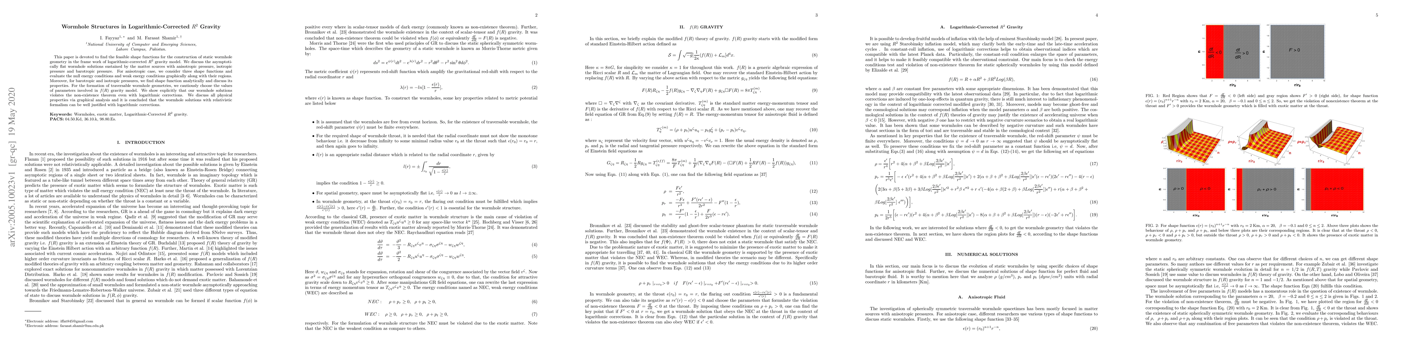This paper is devoted to find the feasible shape functions for the construction of static wormhole geometry in the frame work of logarithmic-corrected $R^2$ gravity model. We discuss the asymptotically flat wormhole solutions sustained by the matter sources with anisotropic pressure, isotropic pressure and barotropic pressure. For anisotropic case, we consider three shape functions and evaluate the null energy conditions and weak energy conditions graphically along with their regions. Moreover, for barotropic and isotropic pressures, we find shape function analytically and discuss its properties. For the formation of traversable wormhole geometries, we cautiously choose the values of parameters involved in $f(R)$ gravity model. We show explicitly that our wormhole solutions violates the non-existence theorem even with logarithmic corrections. We discuss all physical properties via graphical analysis and it is concluded that the wormhole solutions with relativistic formalism can be well justified with logarithmic corrections.