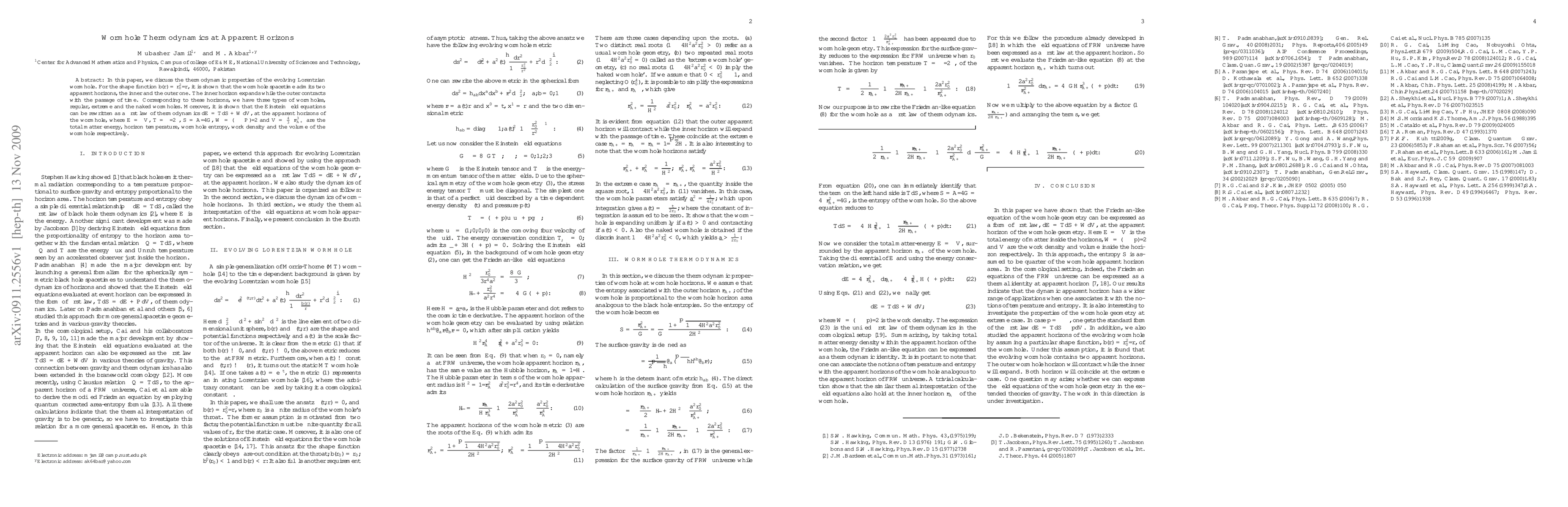 This paper explores the thermodynamic properties of evolving Lorentzian wormholes, demonstrating that the shape function $b(r) = r_{0}^2/r$ leads to two apparent horizons. The Einstein field equations are shown to correspond to a first law of thermodynamics at these horizons, relating the total matter energy, temperature, entropy, work density, and volume of the wormhole.
