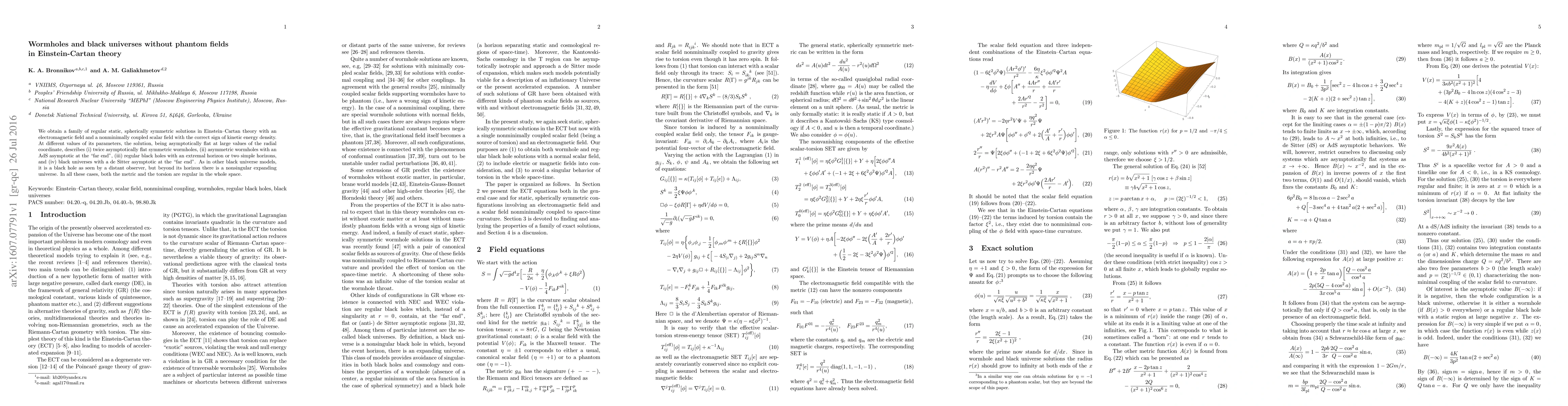 This paper explores static, spherically symmetric solutions in Einstein-Cartan theory that describe wormholes, asymmetric wormholes with AdS asymptotics, regular black holes, and black universes with de Sitter asymptotics, all without requiring phantom fields, and maintains regularity throughout the entire metric and torsion.
