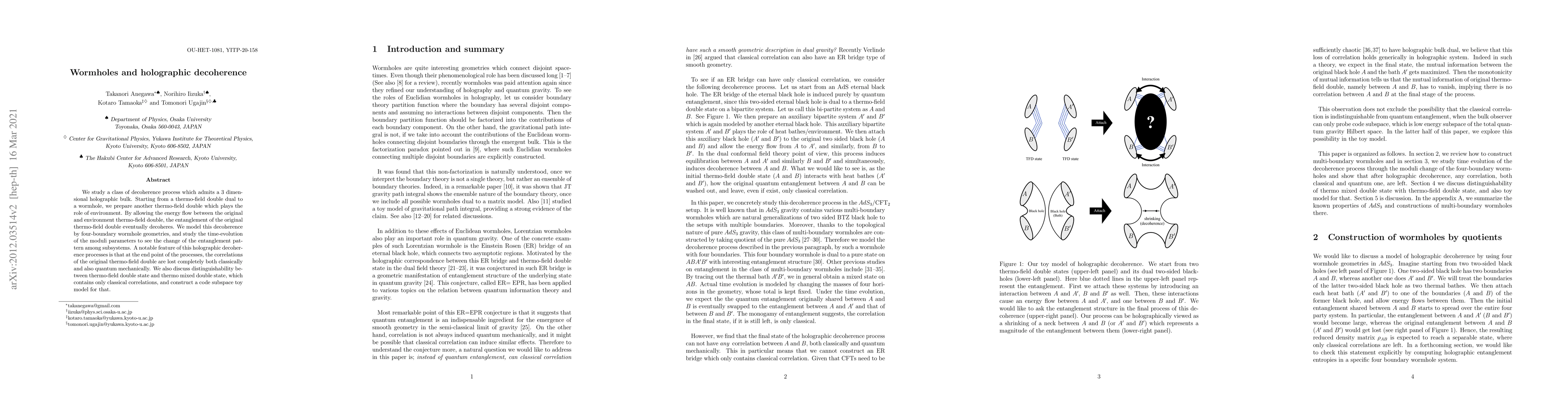 We study a class of decoherence process which admits a 3 dimensional holographic bulk. Starting from a thermo-field double dual to a wormhole, we prepare another thermo-field double which plays the role of environment. By allowing the energy flow between the original and environment thermo-field double, the entanglement of the original thermo-field double eventually decoheres. We model this decoherence by four-boundary wormhole geometries, and study the time-evolution of the moduli parameters to see the change of the entanglement pattern among subsystems. A notable feature of this holographic decoherence processes is that at the end point of the processes, the correlations of the original thermo-field double are lost completely both classically and also quantum mechanically. We also discuss distinguishability between thermo-field double state and thermo mixed double state, which contains only classical correlations, and construct a code subspace toy model for that.