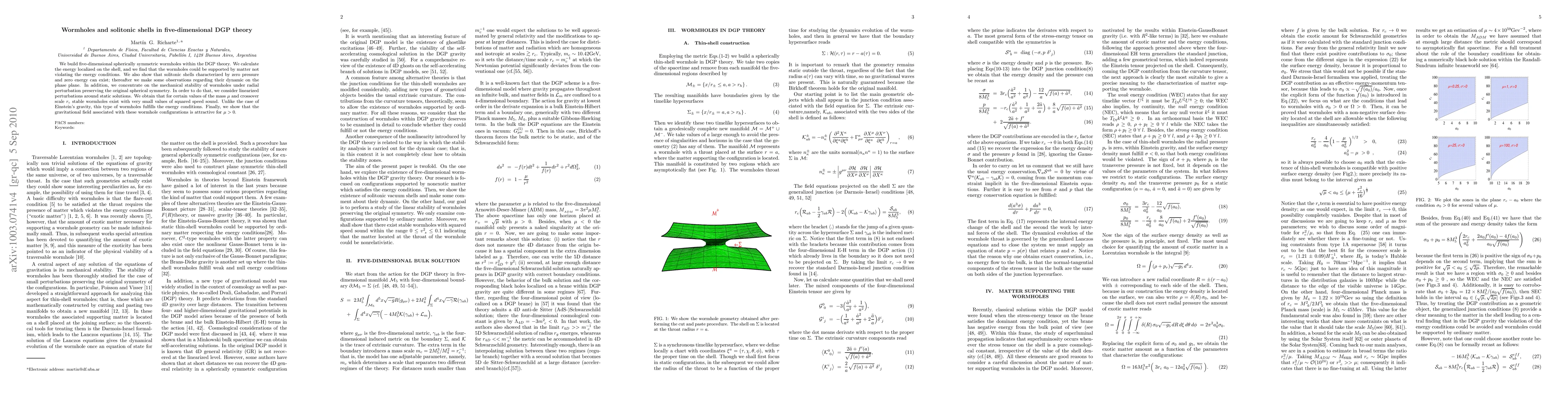 We build five-dimensional spherically symmetric wormholes within the DGP theory. We calculate the energy localized on the shell, and we find that the wormholes could be supported by matter not violating the energy conditions. We also show that solitonic shells characterized by zero pressure and zero energy can exist; thereafter we make some observations regarding their dynamic on the phase plane. In addition, we concentrate on the mechanical stability of wormholes under radial perturbation preserving the original spherical symmetry. In order to do that, we consider linearized perturbations around static solutions. We obtain that for certain values of the mass $\mu$ and crossover scale $r_{c}$ stable wormholes exist with very small values of squared speed sound. Unlike the case of Einstein's gravity, this type of wormholes fulfills the energy conditions. Finally, we show that the gravitational field associated with these wormhole configurations is attractive for $\mu>0$.