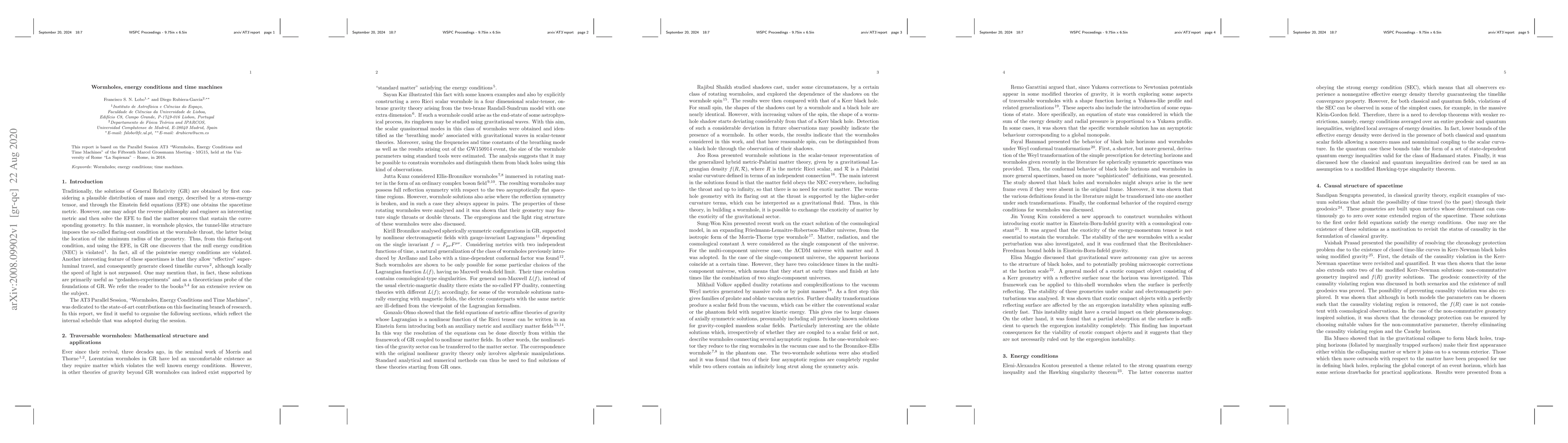This report is based on the Parallel Session AT3 ``Wormholes, Energy Conditions and Time Machines'' of the Fifteenth Marcel Grossmann Meeting - MG15, held at the University of Rome ``La Sapienza'', Rome, in 2018.