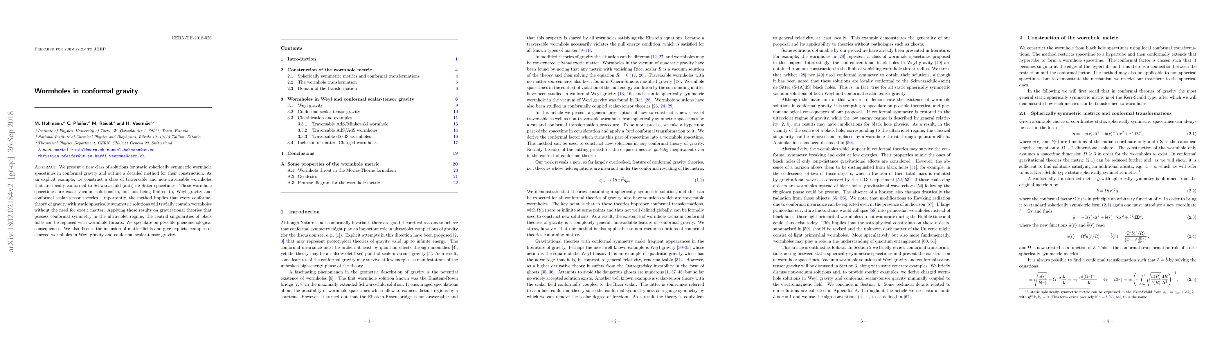 This paper introduces a new class of wormhole solutions in conformal gravity, demonstrating that static spherically symmetric wormholes naturally exist in these theories without requiring exotic matter. It also explores the potential replacement of black hole singularities with wormhole throats and discusses charged wormholes in Weyl gravity and conformal scalar-tensor gravity.