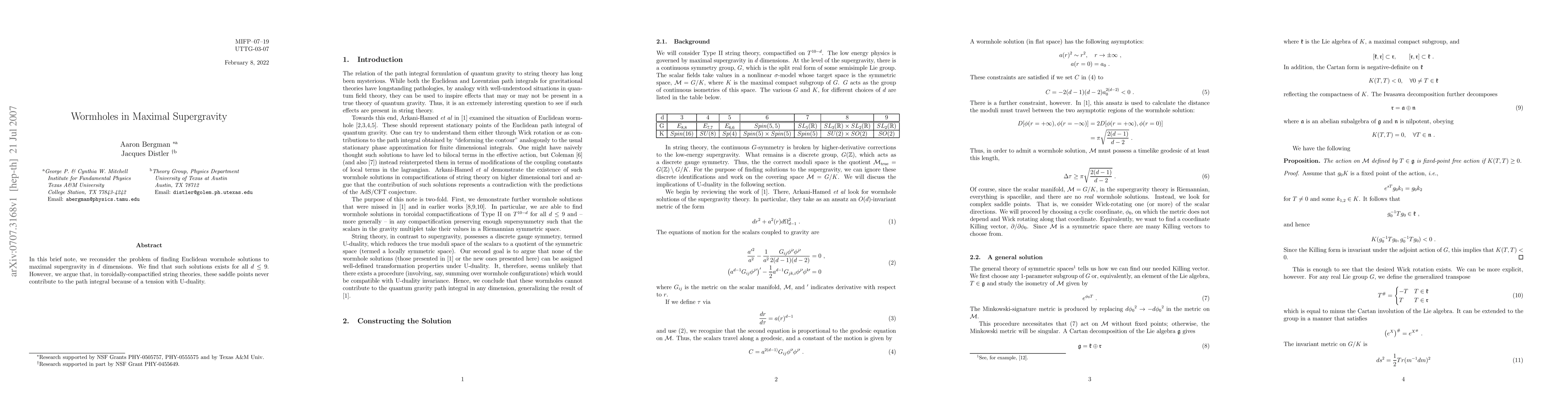 In this brief note, we reconsider the problem of finding Euclidean wormhole solutions to maximal supergravity in d dimensions. We find that such solutions exists for all d less than or equal to 9. However, we argue that, in toroidally-compactified string theories, these saddle points never contribute to the path integral because of a tension with U-duality.