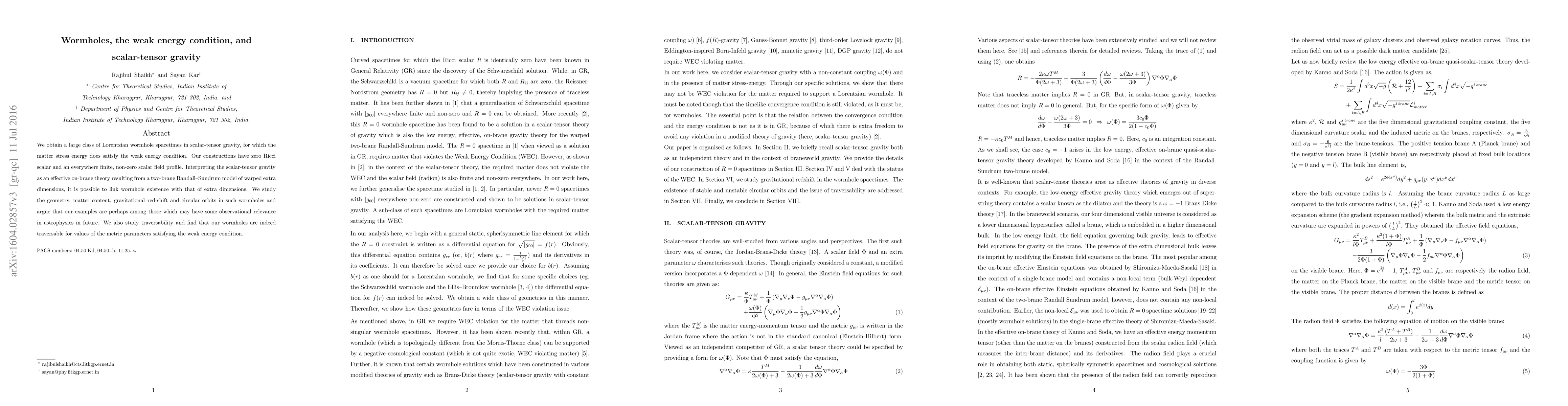 This paper constructs a variety of wormhole spacetimes in scalar-tensor gravity that satisfy the weak energy condition, featuring zero Ricci scalar and a finite scalar field. It explores their geometry, matter content, and potential observational relevance, concluding that these traversable wormholes may have implications for astrophysics.