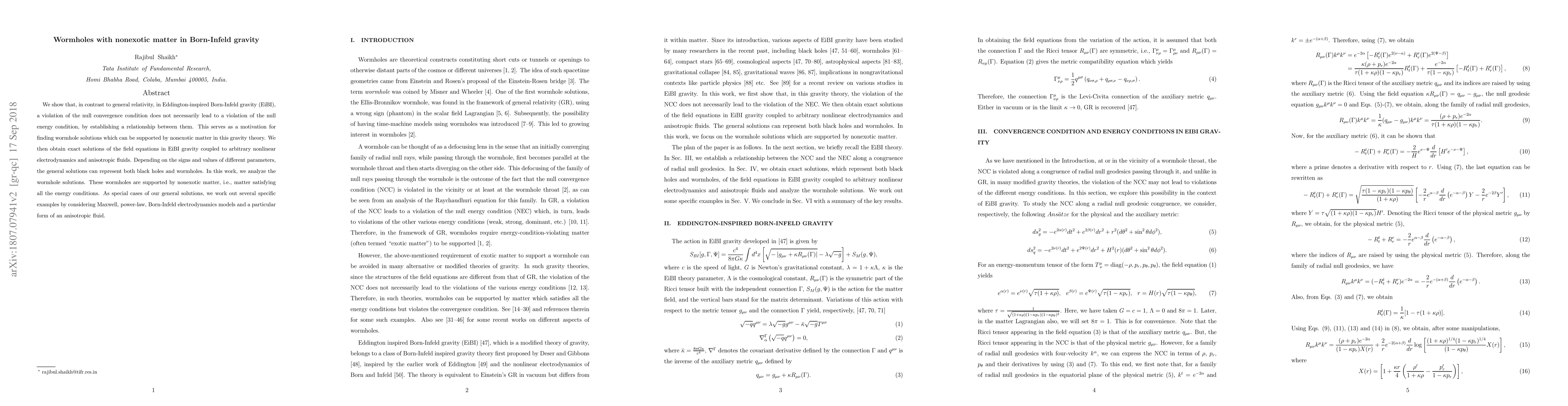 In Born-Infeld gravity, wormholes can be supported by nonexotic matter, unlike in general relativity where violations of the null convergence condition imply violations of the null energy condition. Exact solutions in EiBI gravity show that wormholes can exist with matter satisfying all energy conditions.