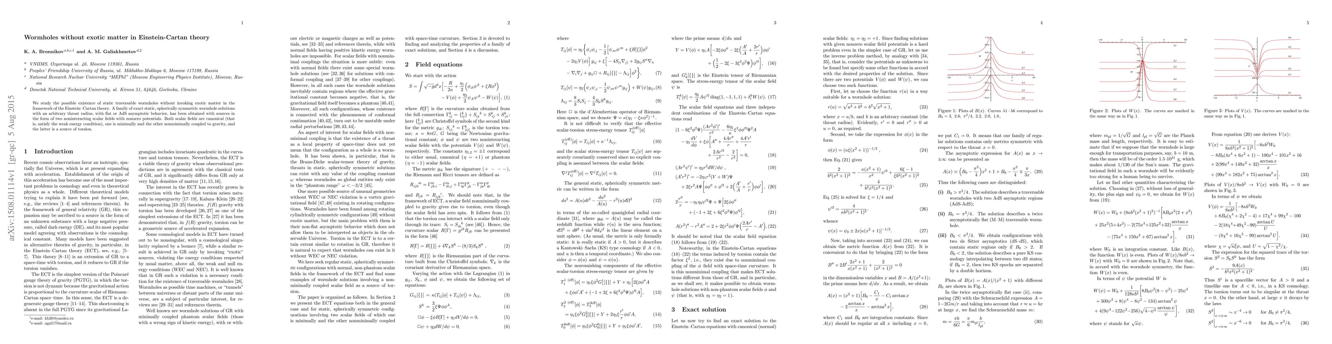 We study the possible existence of static traversable wormholes without invoking exotic matter in the framework of the Einstein--Cartan theory. A family of exact static, spherically symmetric wormhole solutions with an arbitrary throat radius, with flat or AdS asymptotic behavior, has been obtained with sources in the form of two noninteracting scalar fields with nonzero potentials. Both scalar fields are canonical (that is, satisfy the weak energy condition), one is minimally and the other nonminimally coupled to gravity, and the latter is a source of torsion.