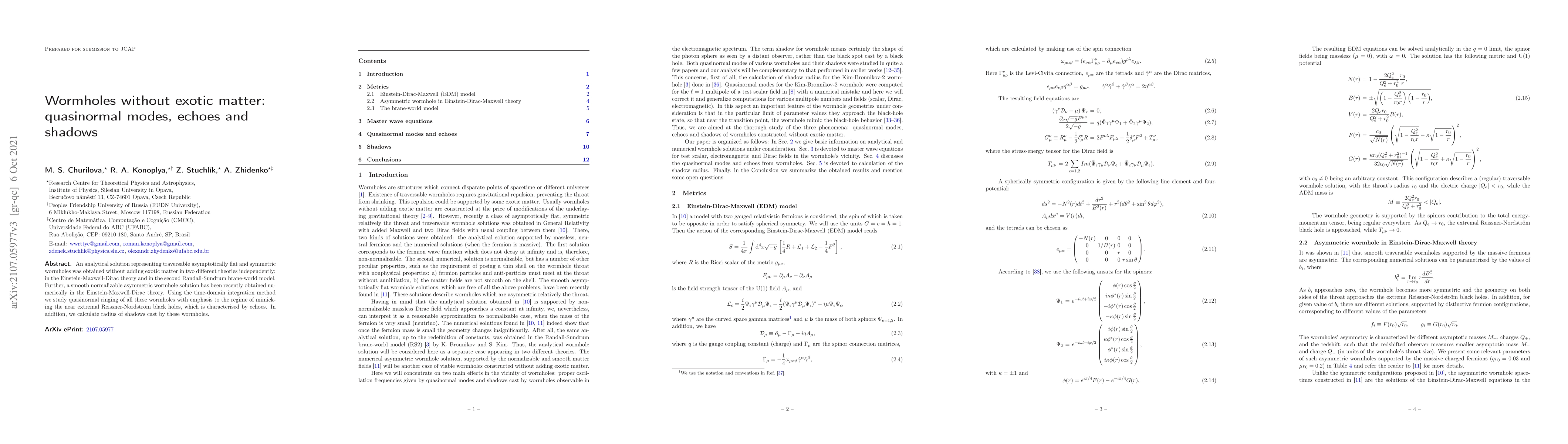 This paper presents analytical solutions for traversable wormholes without exotic matter in Einstein-Maxwell-Dirac theory and the Randall-Sundrum model, and investigates their quasinormal modes and shadows, highlighting the echo phenomenon akin to near-extremal black holes.