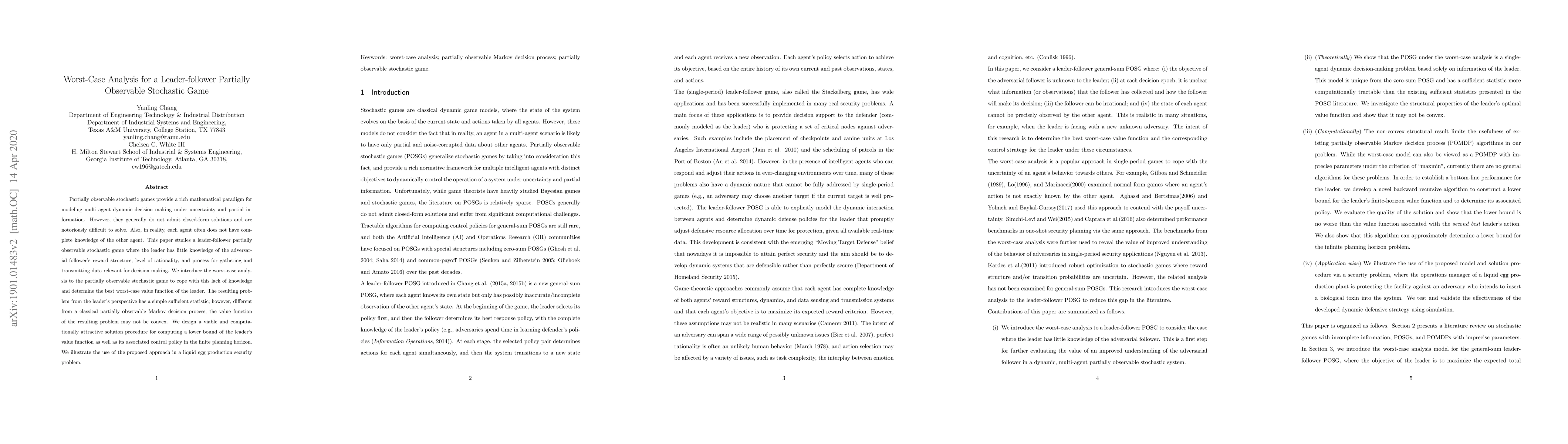 Partially observable stochastic games provide a rich mathematical paradigm for modeling multi-agent dynamic decision making under uncertainty and partial information. However, they generally do not admit closed-form solutions and are notoriously difficult to solve. Also, in reality, each agent often does not have complete knowledge of the other agent. This paper studies a leader-follower partially observable stochastic game where the leader has little knowledge of the adversarial follower's reward structure, level of rationality, and process for gathering and transmitting data relevant for decision making. We introduce the worst-case analysis to the partially observable stochastic game to cope with this lack of knowledge and determine the best worst-case value function of the leader. The resulting problem from the leader's perspective has a simple sufficient statistic; however, different from a classical partially observable Markov decision process, the value function of the resulting problem may not be convex. We design a viable and computationally attractive solution procedure for computing a lower bound of the leader's value function as well as its associated control policy in the finite planning horizon. We illustrate the use of the proposed approach in a liquid egg production security problem.
