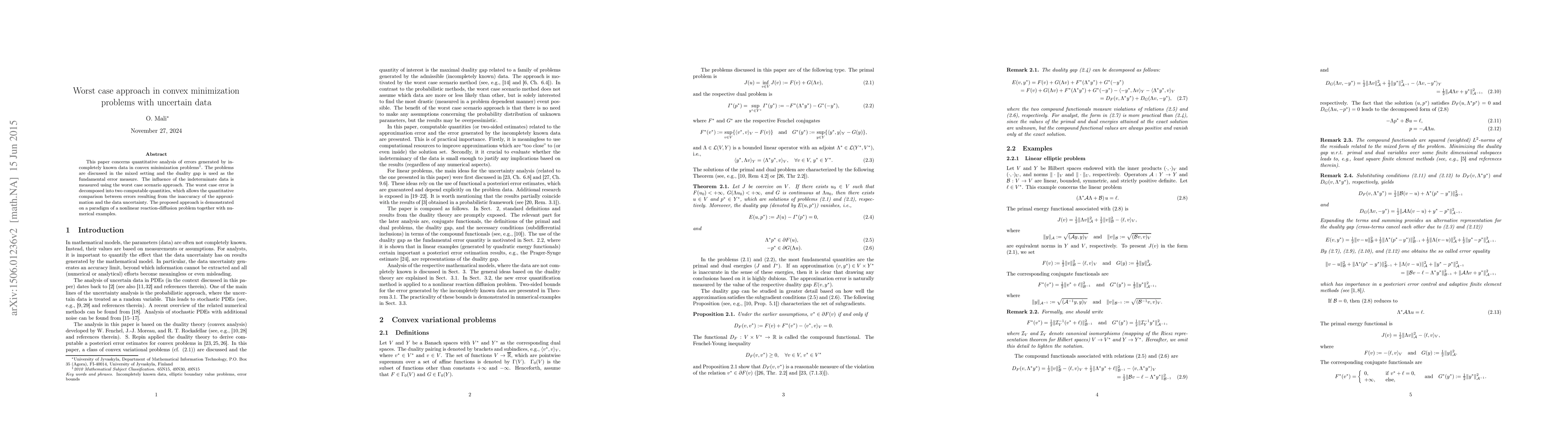 This paper concerns quantitative analysis of errors generated by incompletely known data in convex minimization problems. The problems are discussed in the mixed setting and the duality gap is used as the fundamental error measure. The influence of the indeterminate data is measured using the worst case scenario approach. The worst case error is decomposed into two computable quantities, which allows the quantitative comparison between errors resulting from the inaccuracy of the approximation and the data uncertainty. The proposed approach is demonstrated on a paradigm of a nonlinear reaction-diffusion problem together with numerical examples.