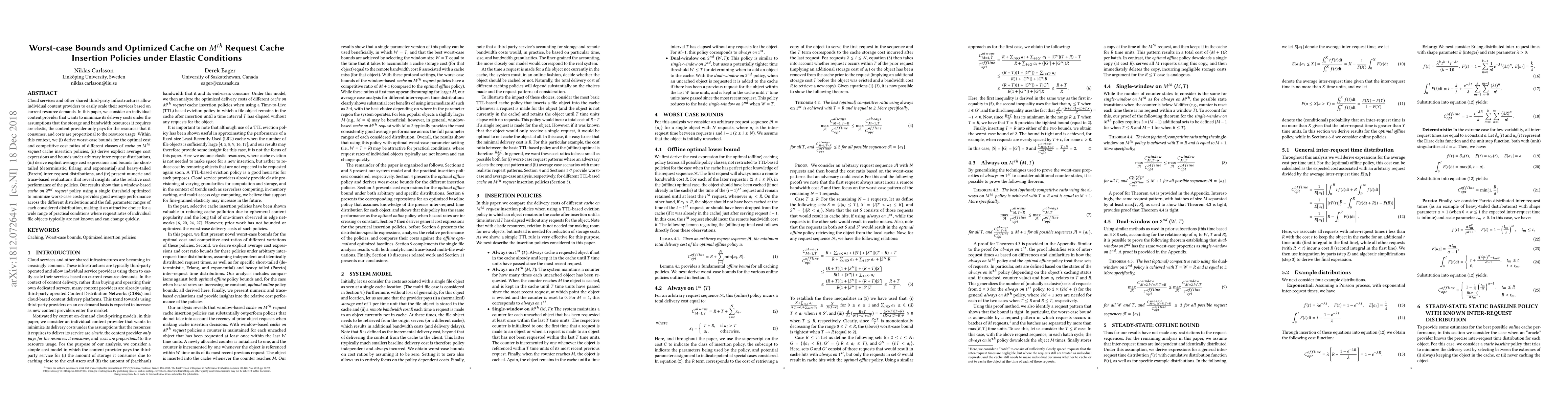 Cloud services and other shared third-party infrastructures allow individual content providers to easily scale their services based on current resource demands. In this paper, we consider an individual content provider that wants to minimize its delivery costs under the assumptions that the storage and bandwidth resources it requires are elastic, the content provider only pays for the resources that it consumes, and costs are proportional to the resource usage. Within this context, we (i) derive worst-case bounds for the optimal cost and competitive cost ratios of different classes of "cache on $M^{th}$ request" cache insertion policies, (ii) derive explicit average cost expressions and bounds under arbitrary inter-request distributions, (iii) derive explicit average cost expressions and bounds for short-tailed (deterministic, Erlang, and exponential) and heavy-tailed (Pareto) inter-request distributions, and (iv) present numeric and trace-based evaluations that reveal insights into the relative cost performance of the policies. Our results show that a window-based "cache on $2^{nd}$ request" policy using a single threshold optimized to minimize worst-case costs provides good average performance across the different distributions and the full parameter ranges of each considered distribution, making it an attractive choice for a wide range of practical conditions where request rates of individual file objects typically are not known and can change quickly.