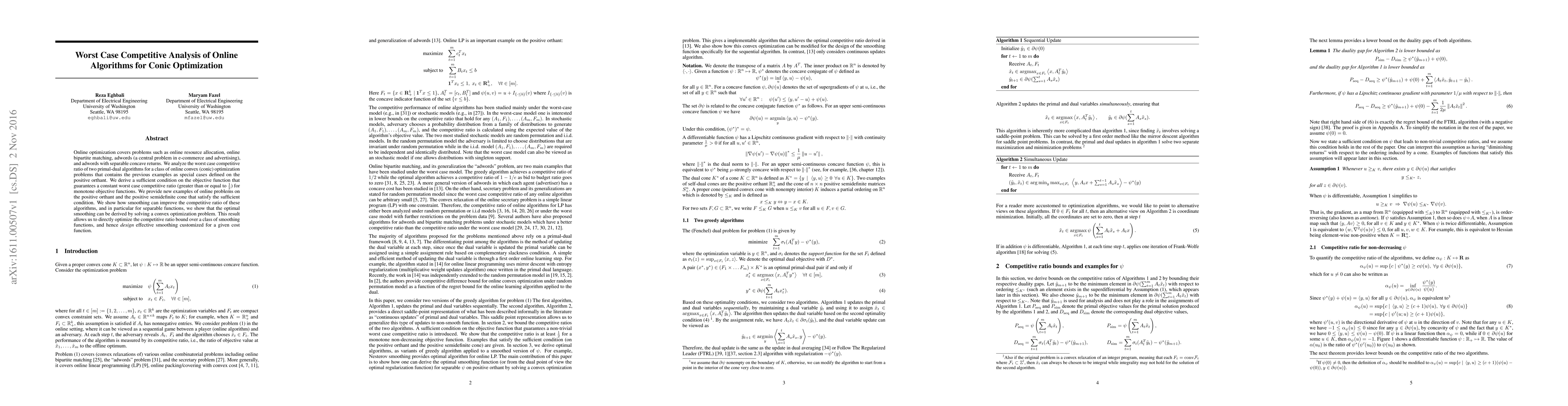 Online optimization covers problems such as online resource allocation, online bipartite matching, adwords (a central problem in e-commerce and advertising), and adwords with separable concave returns. We analyze the worst case competitive ratio of two primal-dual algorithms for a class of online convex (conic) optimization problems that contains the previous examples as special cases defined on the positive orthant. We derive a sufficient condition on the objective function that guarantees a constant worst case competitive ratio (greater than or equal to $\frac{1}{2}$) for monotone objective functions. We provide new examples of online problems on the positive orthant and the positive semidefinite cone that satisfy the sufficient condition. We show how smoothing can improve the competitive ratio of these algorithms, and in particular for separable functions, we show that the optimal smoothing can be derived by solving a convex optimization problem. This result allows us to directly optimize the competitive ratio bound over a class of smoothing functions, and hence design effective smoothing customized for a given cost function.