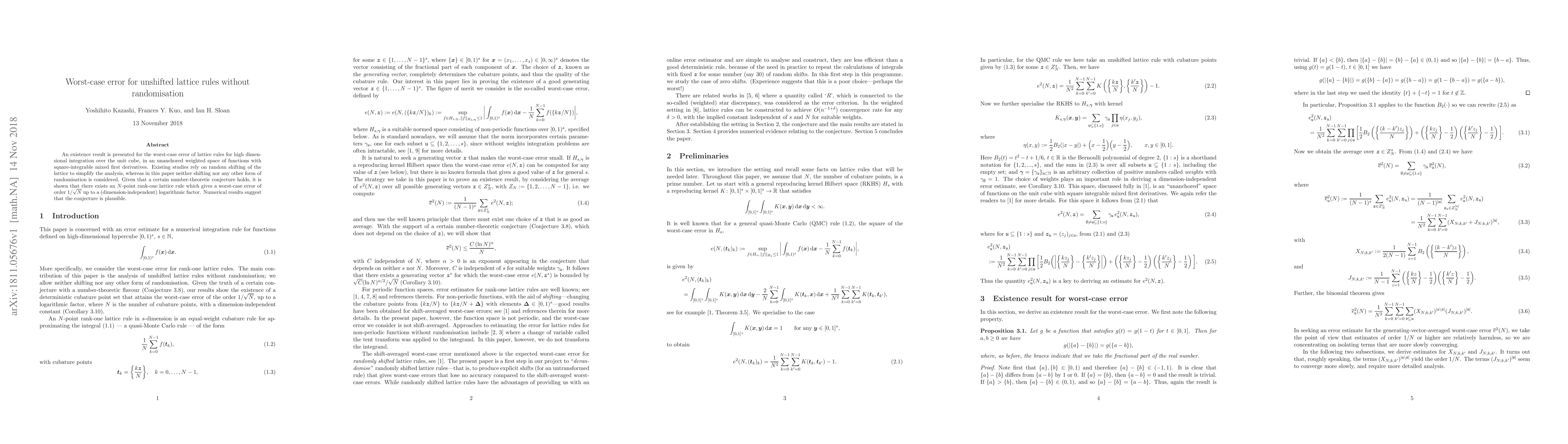 An existence result is presented for the worst-case error of lattice rules for high dimensional integration over the unit cube, in an unanchored weighted space of functions with square-integrable mixed first derivatives. Existing studies rely on random shifting of the lattice to simplify the analysis, whereas in this paper neither shifting nor any other form of randomisation is considered. Given that a certain number-theoretic conjecture holds, it is shown that there exists an $N$-point rank-one lattice rule which gives a worst-case error of order $1/\sqrt{N}$ up to a (dimension-independent) logarithmic factor. Numerical results suggest that the conjecture is plausible.