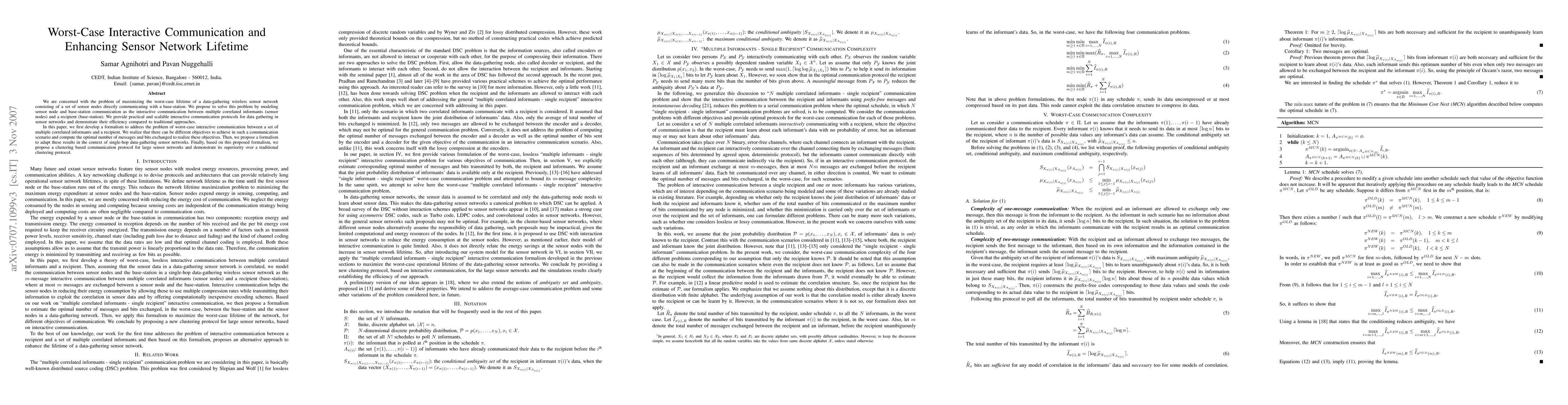 This paper proposes interactive communication protocols to maximize the worst-case lifetime of wireless sensor networks by modeling communication as a process between multiple correlated informants and a recipient. The authors develop a formalism to optimize message and bit exchanges, and introduce a clustering-based protocol that outperforms traditional methods.