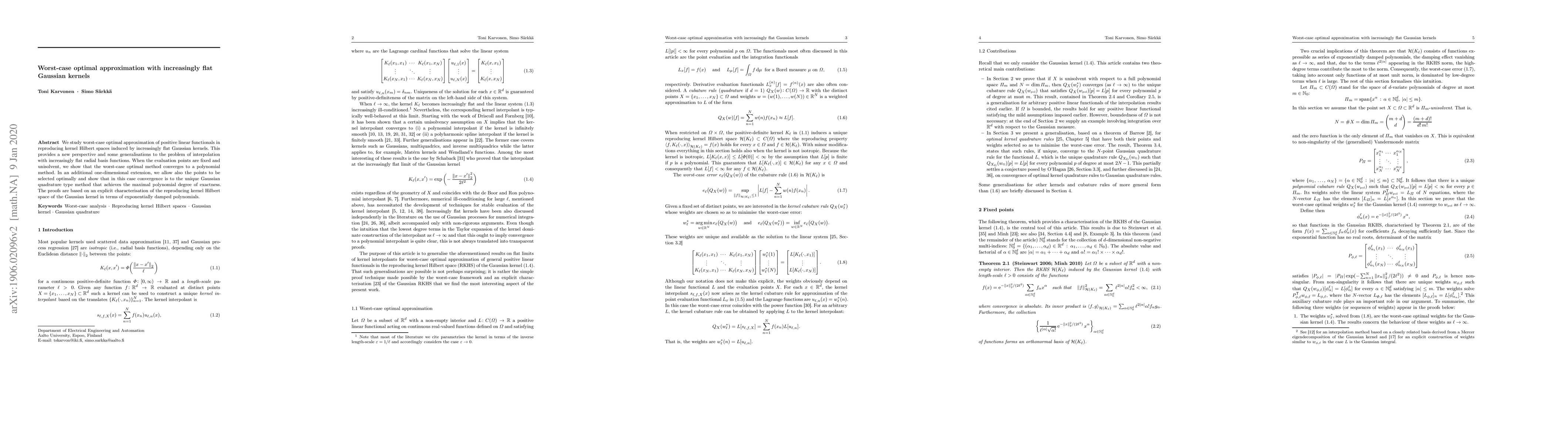 This paper investigates the worst-case optimal approximation in reproducing kernel Hilbert spaces using increasingly flat Gaussian kernels, providing insights into interpolation with radial basis functions. It demonstrates that under fixed unisolvent evaluation points, the optimal method converges to polynomial approximation, and in one-dimensional settings with optimally selected points, it converges to Gaussian quadrature.