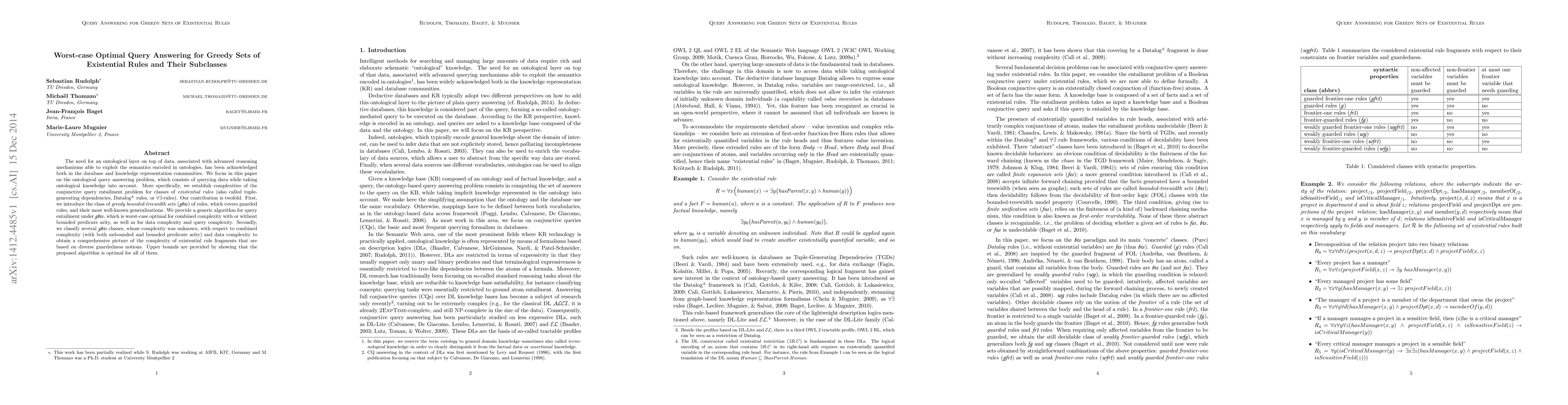 The need for an ontological layer on top of data, associated with advanced reasoning mechanisms able to exploit the semantics encoded in ontologies, has been acknowledged both in the database and knowledge representation communities. We focus in this paper on the ontological query answering problem, which consists of querying data while taking ontological knowledge into account. More specifically, we establish complexities of the conjunctive query entailment problem for classes of existential rules (also called tuple-generating dependencies, Datalog+/- rules, or forall-exists-rules. Our contribution is twofold. First, we introduce the class of greedy bounded-treewidth sets (gbts) of rules, which covers guarded rules, and their most well-known generalizations. We provide a generic algorithm for query entailment under gbts, which is worst-case optimal for combined complexity with or without bounded predicate arity, as well as for data complexity and query complexity. Secondly, we classify several gbts classes, whose complexity was unknown, with respect to combined complexity (with both unbounded and bounded predicate arity) and data complexity to obtain a comprehensive picture of the complexity of existential rule fragments that are based on diverse guardedness notions. Upper bounds are provided by showing that the proposed algorithm is optimal for all of them.