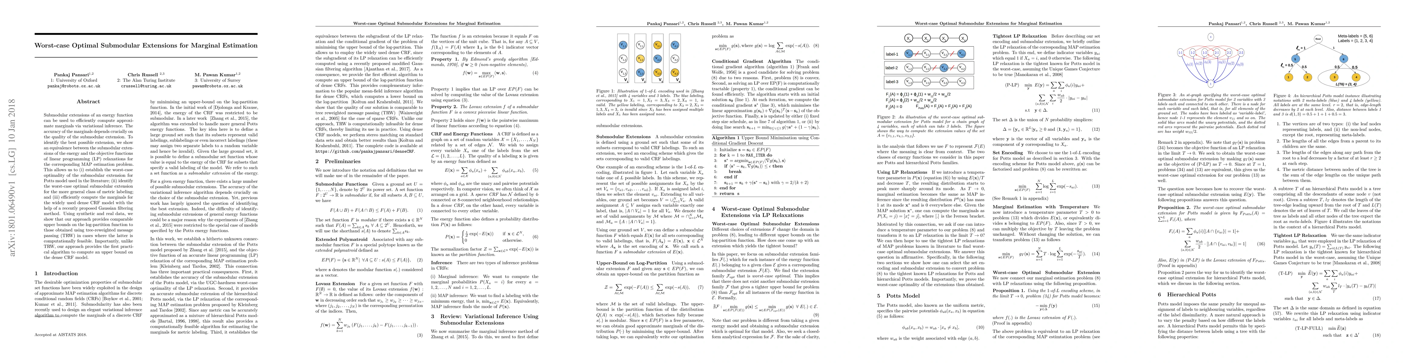 Submodular extensions of an energy function can be used to efficiently compute approximate marginals via variational inference. The accuracy of the marginals depends crucially on the quality of the submodular extension. To identify the best possible extension, we show an equivalence between the submodular extensions of the energy and the objective functions of linear programming (LP) relaxations for the corresponding MAP estimation problem. This allows us to (i) establish the worst-case optimality of the submodular extension for Potts model used in the literature; (ii) identify the worst-case optimal submodular extension for the more general class of metric labeling; and (iii) efficiently compute the marginals for the widely used dense CRF model with the help of a recently proposed Gaussian filtering method. Using synthetic and real data, we show that our approach provides comparable upper bounds on the log-partition function to those obtained using tree-reweighted message passing (TRW) in cases where the latter is computationally feasible. Importantly, unlike TRW, our approach provides the first practical algorithm to compute an upper bound on the dense CRF model.