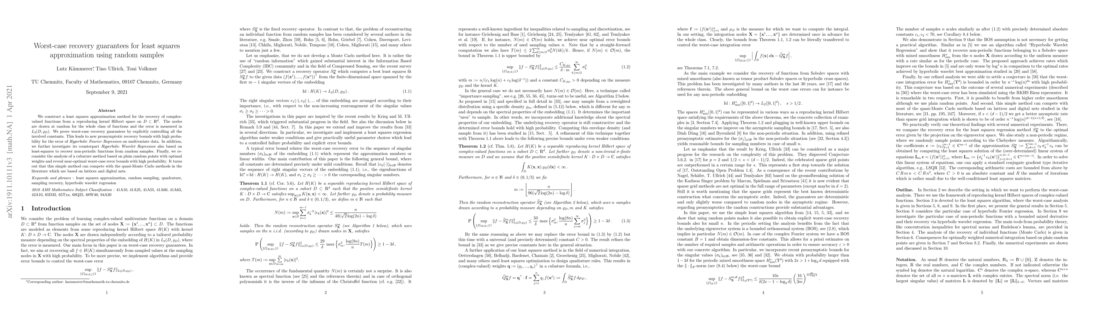 This paper develops a least squares approximation method for recovering complex-valued functions from random samples, providing worst-case recovery guarantees and new preasymptotic bounds for Hyperbolic Fourier and Wavelet Regression. It also demonstrates that a simple cubature method with random points can achieve near-optimal error bounds comparable to quasi-Monte Carlo methods.