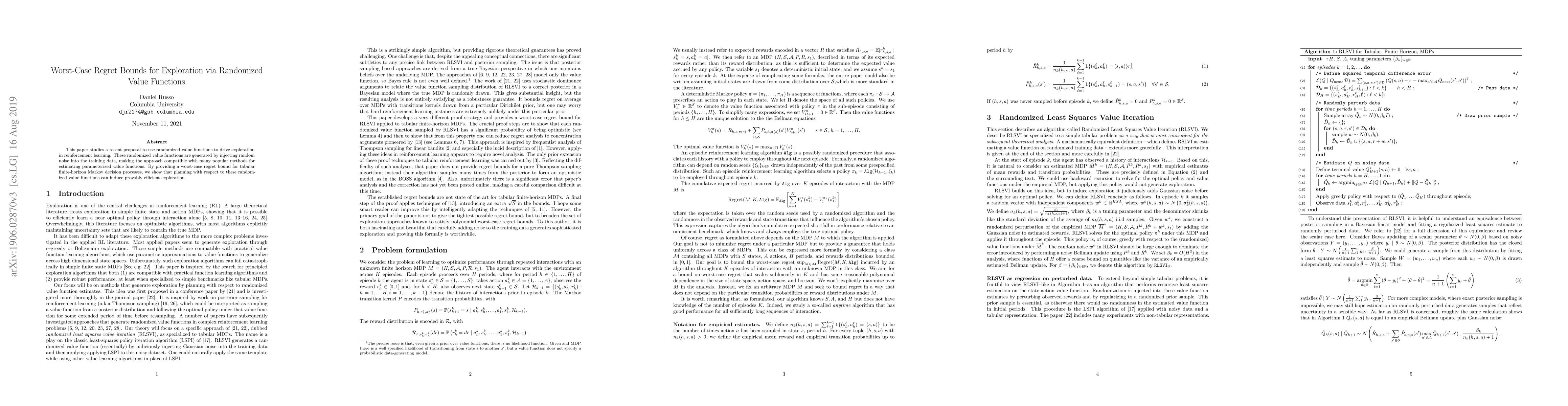 This paper proposes using randomized value functions to enhance exploration in reinforcement learning, demonstrating a worst-case regret bound that proves efficient exploration for tabular finite-horizon Markov decision processes. The approach injects random noise into training data, compatible with various value function estimation methods.