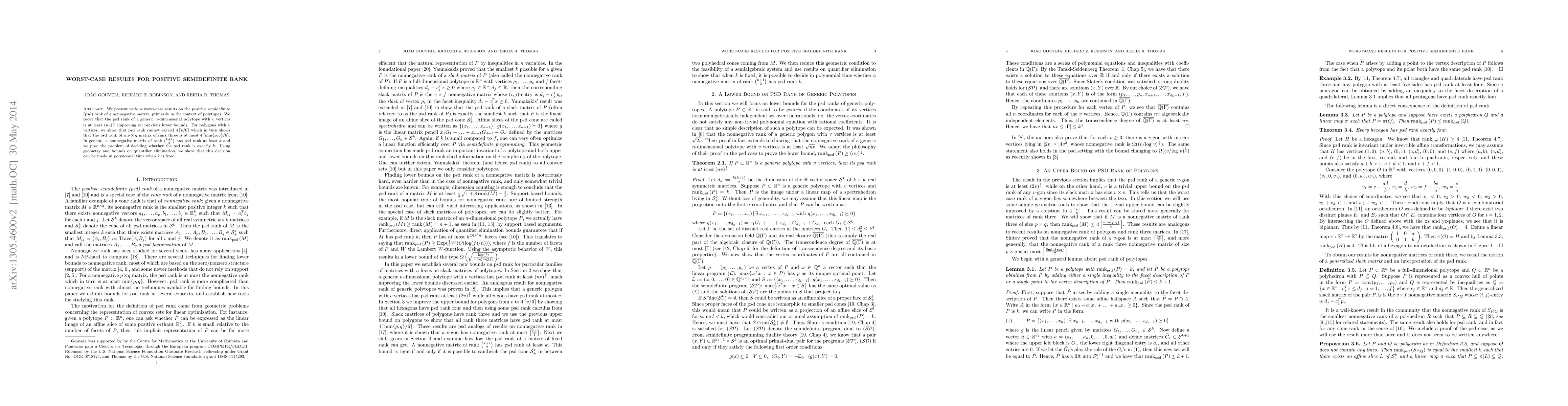 This paper presents various worst-case results on the positive semidefinite (psd) rank of a nonnegative matrix, primarily in the context of polytopes. We prove that the psd rank of a generic n-dimensional polytope with v vertices is at least (nv)^(1/4) improving on previous lower bounds. For polygons with v vertices, we show that psd rank cannot exceed 4ceil(v/6) which in turn shows that the psd rank of a p by q matrix of rank three is at most 4ceil(min{p,q}/6). In general, a nonnegative matrix of rank (k+1 choose 2) has psd rank at least k and we pose the problem of deciding whether the psd rank is exactly k. Using geometry and bounds on quantifier elimination, we show that this decision can be made in polynomial time when k is fixed.