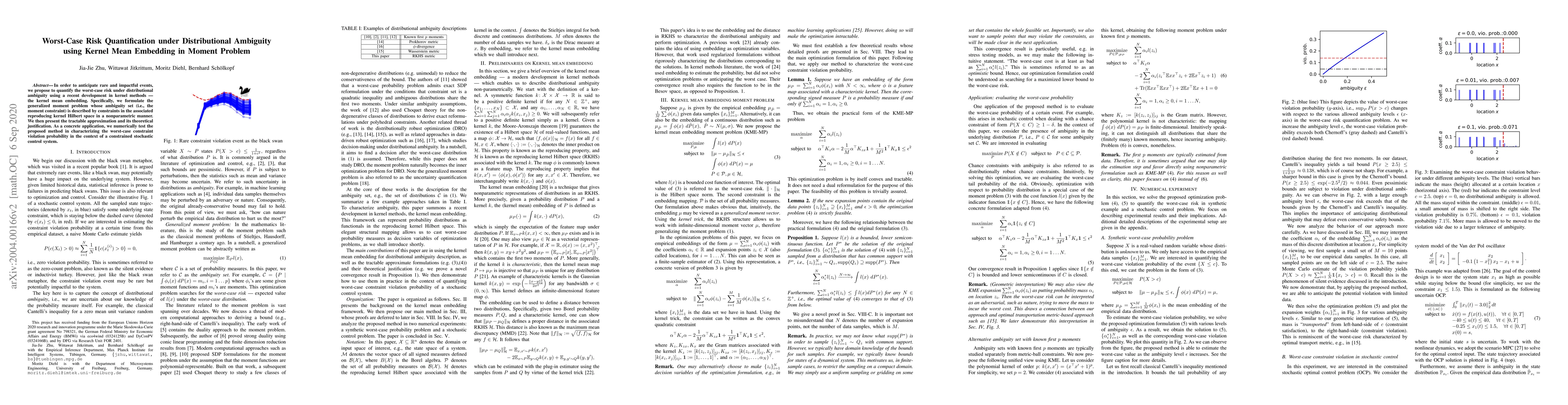 In order to anticipate rare and impactful events, we propose to quantify the worst-case risk under distributional ambiguity using a recent development in kernel methods -- the kernel mean embedding. Specifically, we formulate the generalized moment problem whose ambiguity set (i.e., the moment constraint) is described by constraints in the associated reproducing kernel Hilbert space in a nonparametric manner. We then present the tractable approximation and its theoretical justification. As a concrete application, we numerically test the proposed method in characterizing the worst-case constraint violation probability in the context of a constrained stochastic control system.