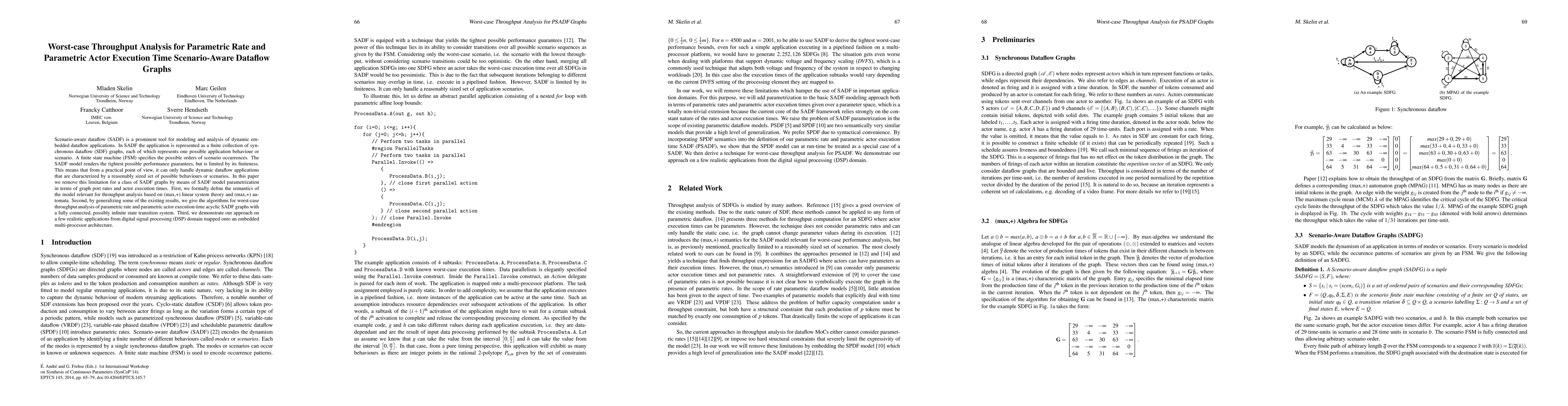 This paper presents algorithms for worst-case throughput analysis of scenario-aware dataflow graphs (SADF) with parametric rates and execution times, extending the model to handle a larger set of behaviors. It leverages (max,+) linear system theory and automata to define the model's semantics and provides generalized algorithms for acyclic SADF graphs with infinite state transitions.