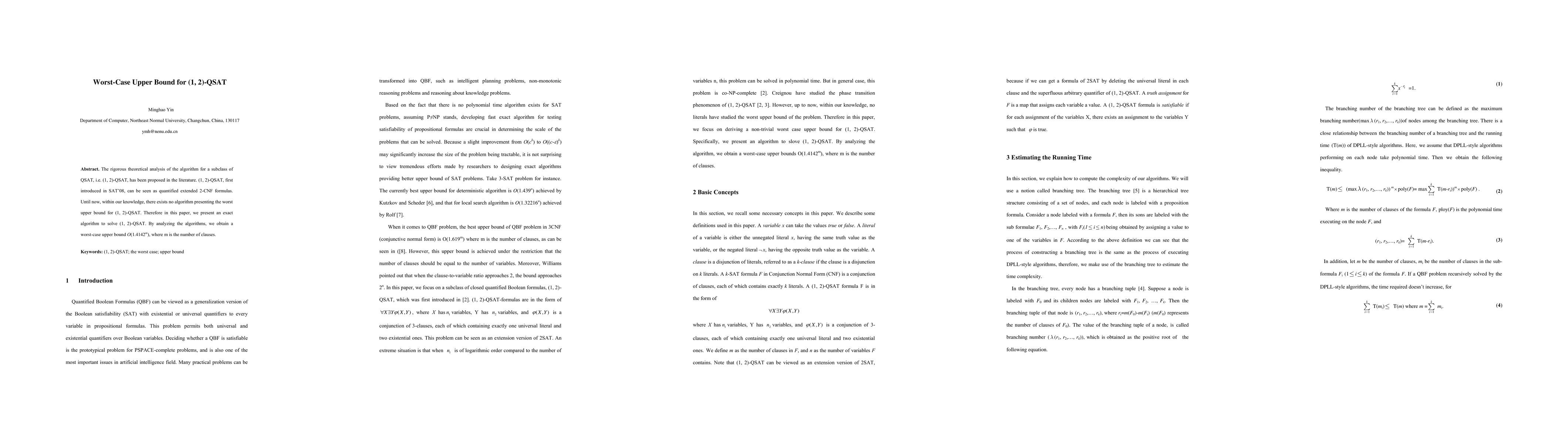 The rigorous theoretical analysis of the algorithm for a subclass of QSAT, i.e. (1, 2)-QSAT, has been proposed in the literature. (1, 2)-QSAT, first introduced in SAT'08, can be seen as quantified extended 2-CNF formulas. Until now, within our knowledge, there exists no algorithm presenting the worst upper bound for (1, 2)-QSAT. Therefore in this paper, we present an exact algorithm to solve (1, 2)-QSAT. By analyzing the algorithms, we obtain a worst-case upper bound O(1.4142m), where m is the number of clauses.