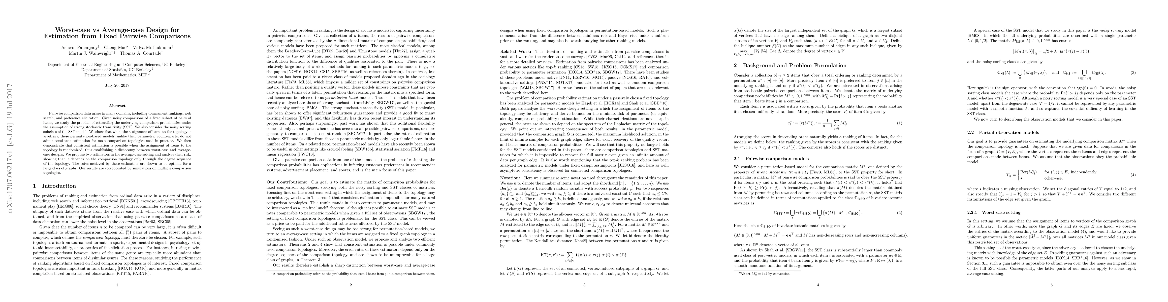 Pairwise comparison data arises in many domains, including tournament rankings, web search, and preference elicitation. Given noisy comparisons of a fixed subset of pairs of items, we study the problem of estimating the underlying comparison probabilities under the assumption of strong stochastic transitivity (SST). We also consider the noisy sorting subclass of the SST model. We show that when the assignment of items to the topology is arbitrary, these permutation-based models, unlike their parametric counterparts, do not admit consistent estimation for most comparison topologies used in practice. We then demonstrate that consistent estimation is possible when the assignment of items to the topology is randomized, thus establishing a dichotomy between worst-case and average-case designs. We propose two estimators in the average-case setting and analyze their risk, showing that it depends on the comparison topology only through the degree sequence of the topology. The rates achieved by these estimators are shown to be optimal for a large class of graphs. Our results are corroborated by simulations on multiple comparison topologies.