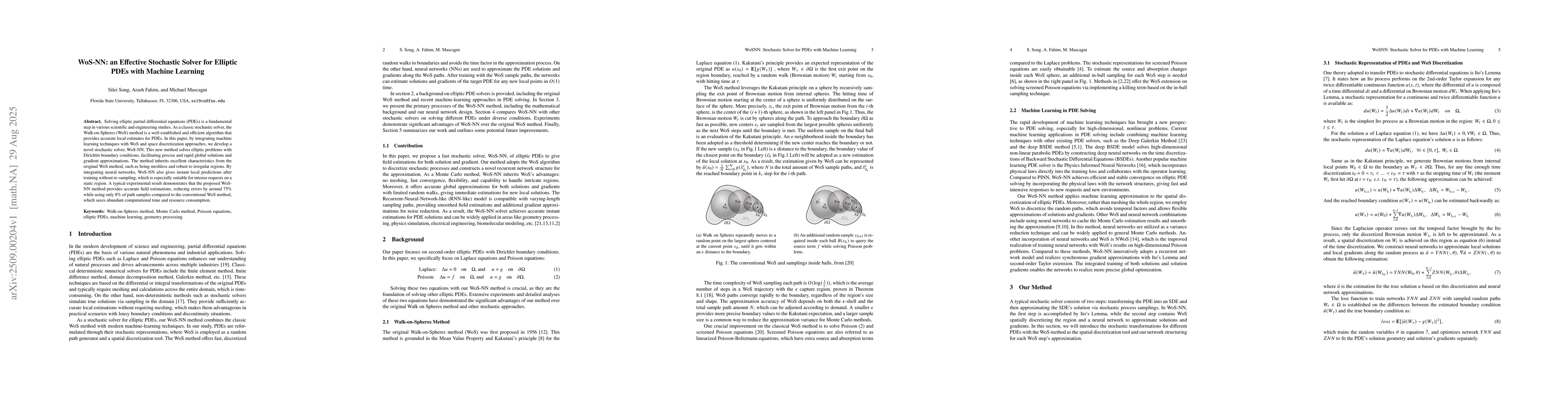 Solving elliptic partial differential equations (PDEs) is a fundamental step in various scientific and engineering studies. As a classic stochastic solver, the Walk-on-Spheres (WoS) method is a well-established and efficient algorithm that provides accurate local estimates for PDEs. In this paper, by integrating machine learning techniques with WoS and space discretization approaches, we develop a novel stochastic solver, WoS-NN. This new method solves elliptic problems with Dirichlet boundary conditions, facilitating precise and rapid global solutions and gradient approximations. The method inherits excellent characteristics from the original WoS method, such as being meshless and robust to irregular regions. By integrating neural networks, WoS-NN also gives instant local predictions after training without re-sampling, which is especially suitable for intense requests on a static region. A typical experimental result demonstrates that the proposed WoS-NN method provides accurate field estimations, reducing errors by around $75\%$ while using only $8\%$ of path samples compared to the conventional WoS method, which saves abundant computational time and resource consumption.