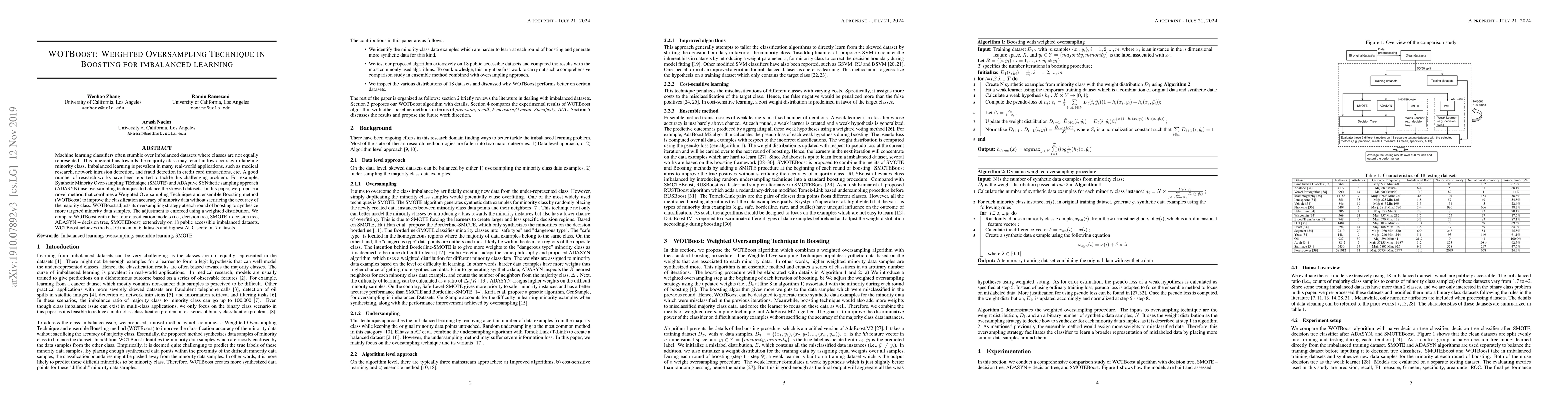 WOTBoost combines a weighted oversampling technique with boosting to enhance minority class classification in imbalanced datasets, achieving superior G mean and AUC scores on multiple public datasets compared to other methods.
