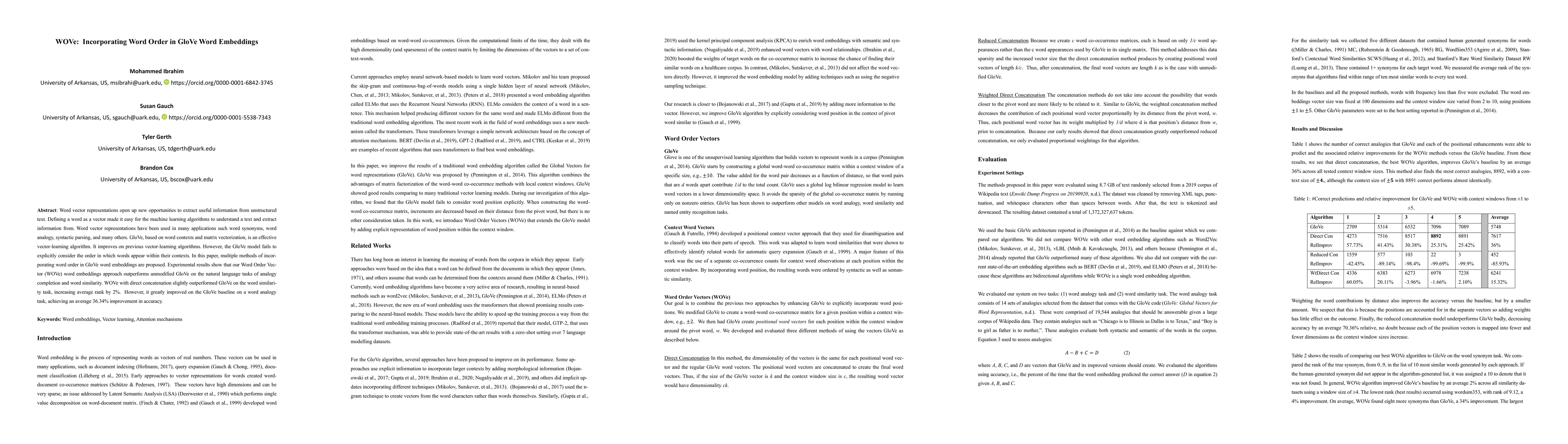This paper proposes methods to incorporate word order into GloVe word embeddings, resulting in Word Order Vector (WOVe) representations. Experimental results show WOVe outperforms unmodified GloVe in natural language tasks, notably achieving a 36.34% improvement in word analogy accuracy.