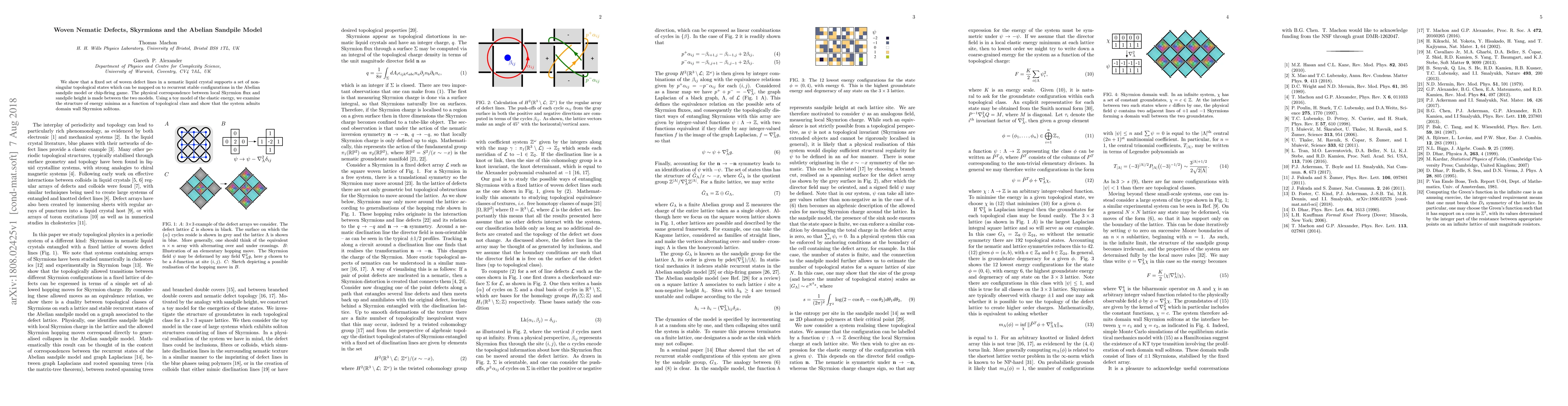 We show that a fixed set of woven defect lines in a nematic liquid crystal supports a set of non-singular topological states which can be mapped on to recurrent stable configurations in the Abelian sandpile model or chip-firing game. The physical correspondence between local Skyrmion flux and sandpile height is made between the two models. Using a toy model of the elastic energy, we examine the structure of energy minima as a function of topological class and show that the system admits domain wall Skyrmion solitons.