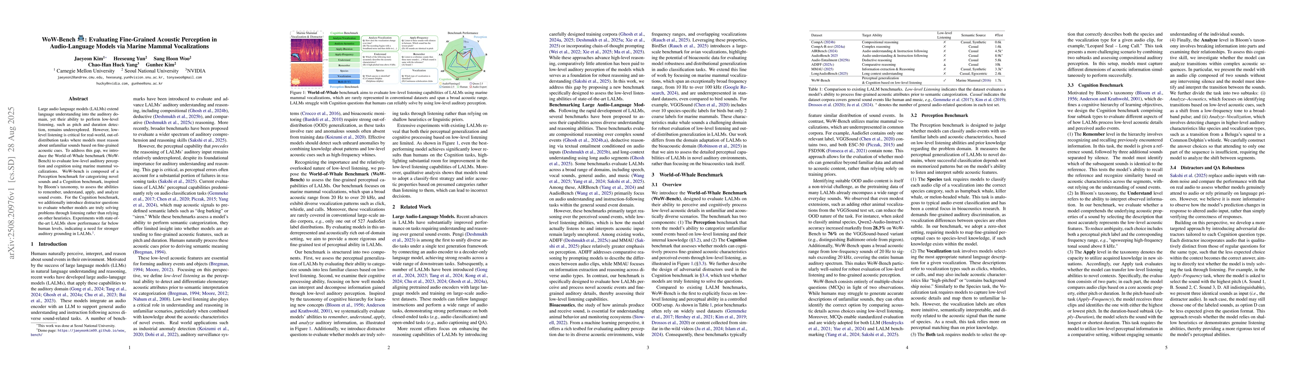 Large audio language models (LALMs) extend language understanding into the auditory domain, yet their ability to perform low-level listening, such as pitch and duration detection, remains underexplored. However, low-level listening is critical for real-world, out-of-distribution tasks where models must reason about unfamiliar sounds based on fine-grained acoustic cues. To address this gap, we introduce the World-of-Whale benchmark (WoW-Bench) to evaluate low-level auditory perception and cognition using marine mammal vocalizations. WoW-bench is composed of a Perception benchmark for categorizing novel sounds and a Cognition benchmark, inspired by Bloom's taxonomy, to assess the abilities to remember, understand, apply, and analyze sound events. For the Cognition benchmark, we additionally introduce distractor questions to evaluate whether models are truly solving problems through listening rather than relying on other heuristics. Experiments with state-of-the-art LALMs show performance far below human levels, indicating a need for stronger auditory grounding in LALMs.