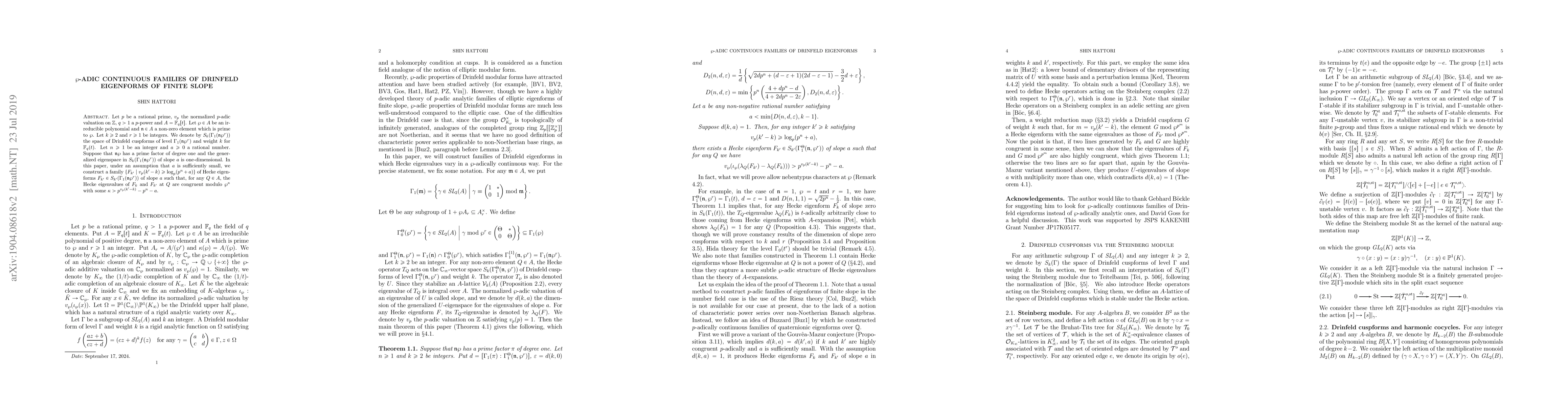 Let $p$ be a rational prime, $v_p$ the normalized $p$-adic valuation on $\mathbb{Z}$, $q>1$ a $p$-power and $A=\mathbb{F}_q[t]$. Let $\wp\in A$ be an irreducible polynomial and $\mathfrak{n}\in A$ a non-zero element which is prime to $\wp$. Let $k\geq 2$ and $r\geq 1$ be integers. We denote by $S_k(\Gamma_1(\mathfrak{n}\wp^r))$ the space of Drinfeld cuspforms of level $\Gamma_1(\mathfrak{n}\wp^r)$ and weight $k$ for $A$. Let $n\geq 1$ be an integer and $a\geq 0$ a rational number. Suppose that $\mathfrak{n}\wp$ has a prime factor of degree one and the generalized eigenspace in $S_k(\Gamma_1(\mathfrak{n}\wp^r))$ of slope $a$ is one-dimensional. In this paper, under an assumption that $a$ is sufficiently small, we construct a family $\{F_{k'}\mid v_p(k'-k)\geq \log_p(p^n+a)\}$ of Hecke eigenforms $F_{k'}\in S_{k'}(\Gamma_1(\mathfrak{n}\wp^r))$ of slope $a$ such that, for any $Q\in A$, the Hecke eigenvalues of $F_k$ and $F_{k'}$ at $Q$ are congruent modulo $\wp^\kappa$ with some $\kappa>p^{v_p(k'-k)}-p^n-a$.
