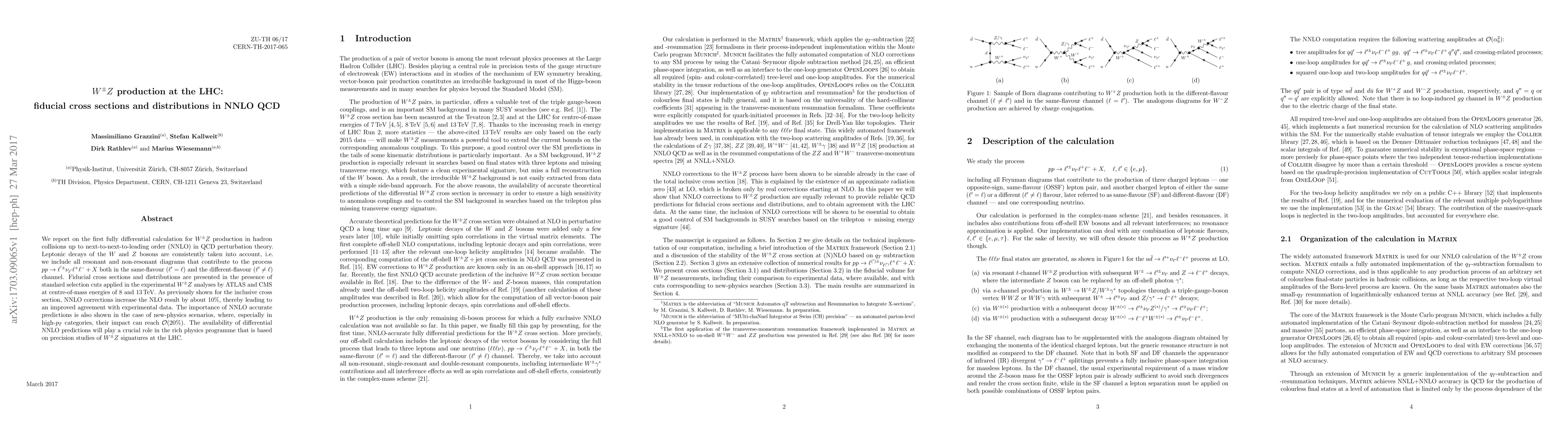 This paper presents the first fully differential NNLO QCD calculation for $W^\pm Z$ production in proton-proton collisions at the LHC, including leptonic decays and both same- and different-flavour channels. NNLO corrections improve agreement with experimental data and are crucial for precision studies and new-physics scenarios.