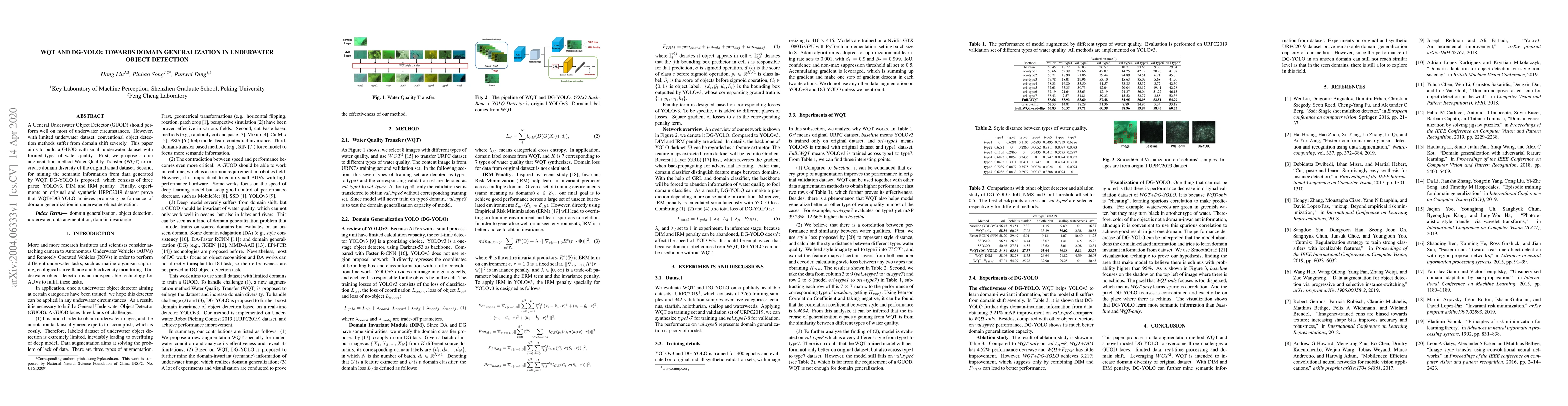 This paper proposes a General Underwater Object Detector (GUOD) that tackles the challenge of limited underwater datasets and domain shift. It introduces Water Quality Transfer (WQT) for data augmentation and DG-YOLO, which combines YOLOv3, DIM, and IRM penalty, to achieve effective domain generalization in underwater object detection.