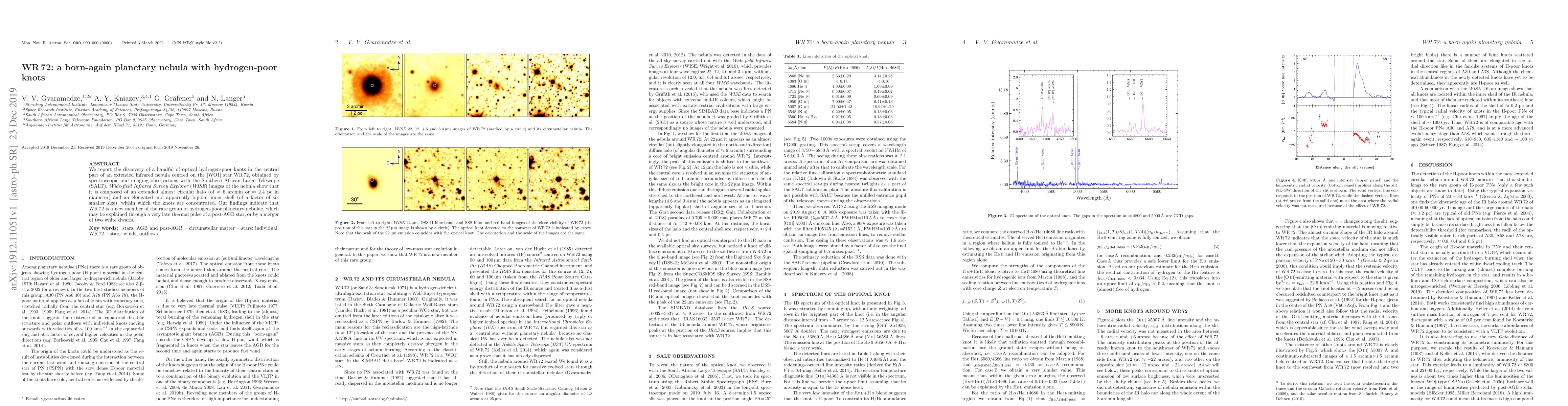 We report the discovery of a handful of optical hydrogen-poor knots in the central part of an extended infrared nebula centred on the [WO1] star WR 72, obtained by spectroscopic and imaging observations with the Southern African Large Telescope (SALT). Wide-field Infrared Survey Explorer (WISE) images of the nebula show that it is composed of an extended almost circular halo (of $\approx6$ arcmin or $\approx2.4$ pc in diameter) and an elongated and apparently bipolar inner shell (of a factor of six smaller size), within which the knots are concentrated. Our findings indicate that WR 72 is a new member of the rare group of hydrogen-poor planetary nebulae, which may be explained through a very late thermal pulse of a post-AGB star, or by a merger of two white dwarfs.
