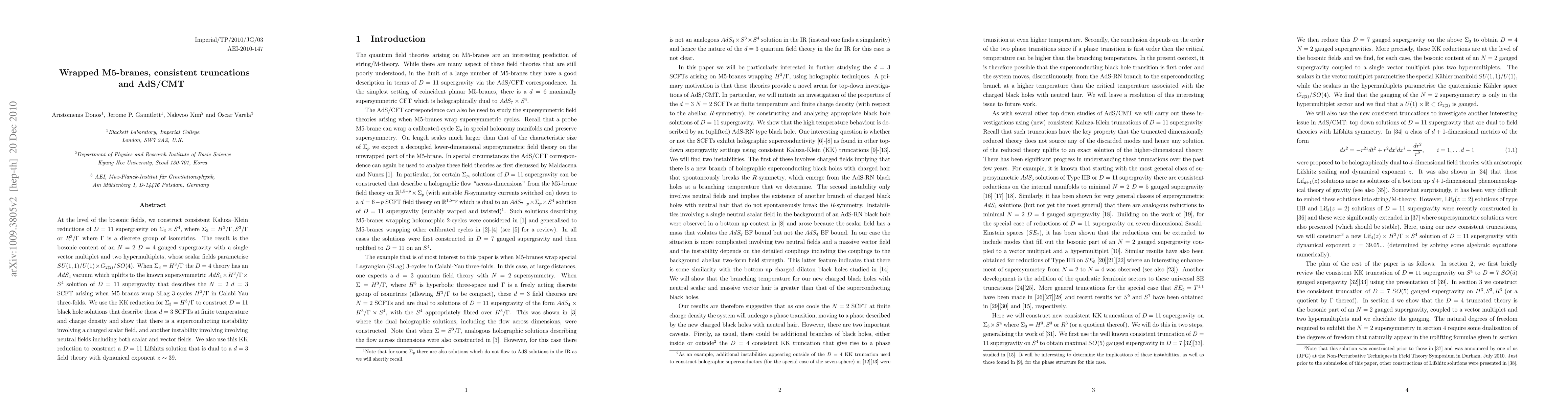 At the level of the bosonic fields, we construct consistent Kaluza--Klein reductions of D=11 supergravity on $\Sigma_3\times S^4$, where $\Sigma_3=H^3/\Gamma,S^3/\Gamma$ or $R^3/\Gamma$ where $\Gamma$ is a discrete group of isometries. The result is the bosonic content of an N=2 D=4 gauged supergravity with a single vector multiplet and two hypermultiplets, whose scalar fields parametrise $SU(1,1)/U(1)\times G_{2(2)}/SO(4)$. %, and the gauging is only in the hypermultiplet When $\Sigma_3=H^3/\Gamma$ the D=4 theory has an $AdS_4$ vacuum which uplifts to the known supersymmetric $AdS_4\times H^3/\Gamma\times S^4$ solution of D=11 supergravity that describes the N=2 $d=3$ SCFT arising when M5-branes wrap SLag 3-cycles $H^3/\Gamma$ in Calabi-Yau three-folds. We use the KK reduction for $\Sigma_3=H^3/\Gamma$ to construct D=11 black hole solutions that describe these d=3 SCFTs at finite temperature and charge density and show that there is a superconducting instability involving a charged scalar field, and another instability involving involving neutral fields including both scalar and vector fields. We also use this KK reduction to construct a D=11 Lifshitz solution that is dual to a d=3 field theory with dynamical exponent $z\sim 39$.