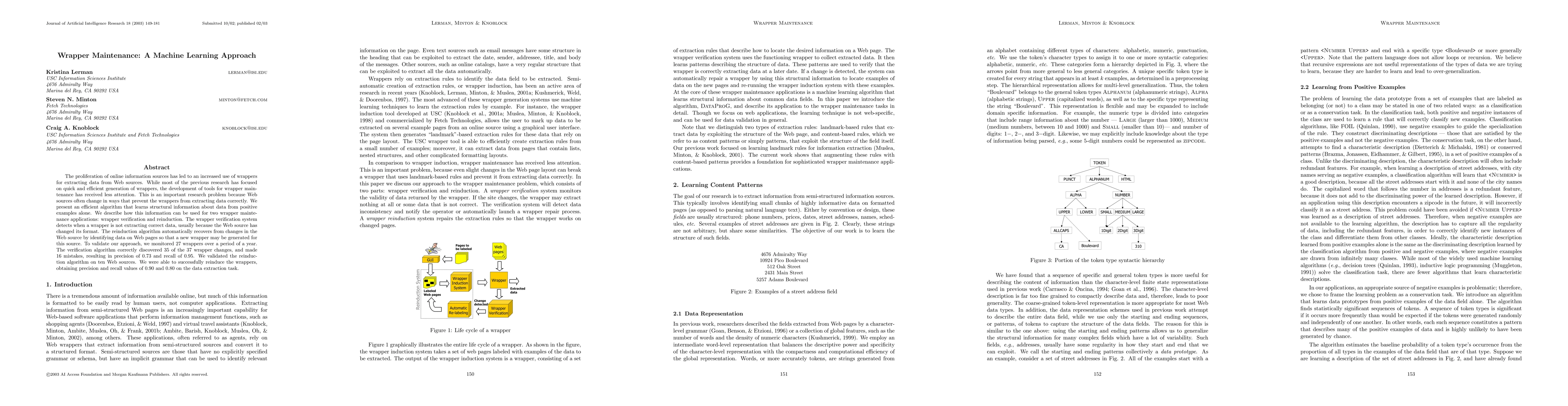 This paper proposes an efficient machine learning algorithm for maintaining wrappers that extract data from web sources, focusing on wrapper verification and reinduction to adapt to changes in web formats. The verification system achieved 73% precision and 95% recall, while the reinduction algorithm successfully recovered wrappers with 90% precision and 80% recall.