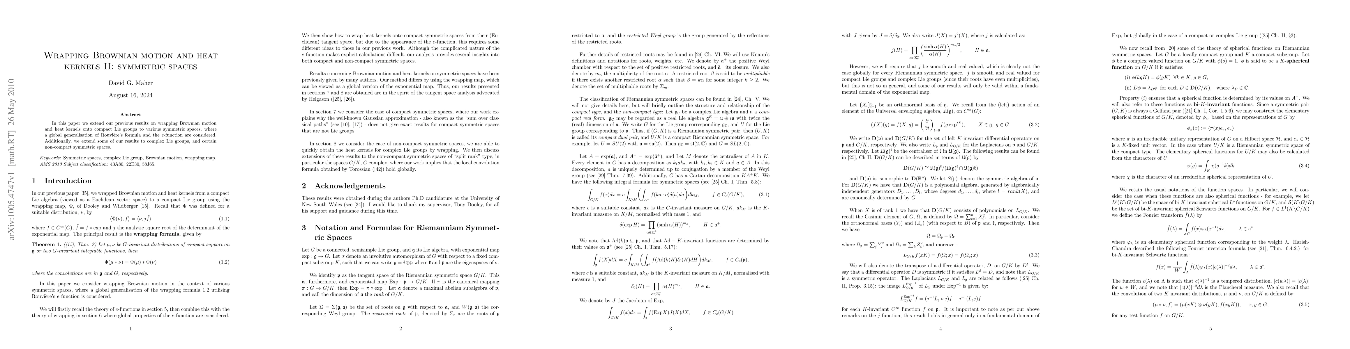 This paper extends previous findings on wrapping Brownian motion and heat kernels to symmetric spaces, including a global generalization of Rouvière's formula and the $e$-function. It also extends some results to complex Lie groups and certain non-compact symmetric spaces.