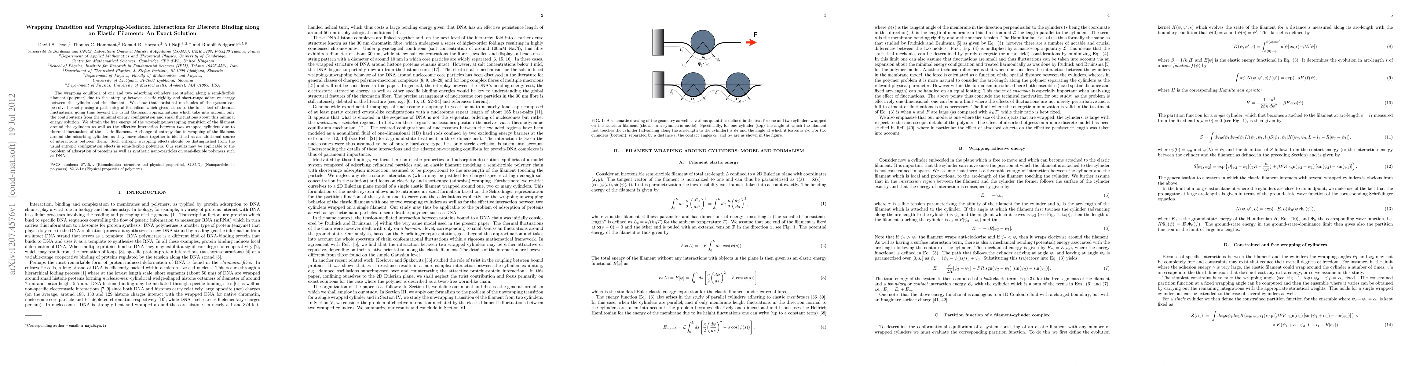 This paper presents an exact solution for the statistical mechanics of wrapping equilibria of adsorbing cylinders along a semi-flexible filament, revealing the full thermal fluctuation effects beyond Gaussian approximations. The study identifies entropic wrapping effects as an additional interaction source between cylinders, with implications for protein and nanoparticle adsorption on polymers like DNA.