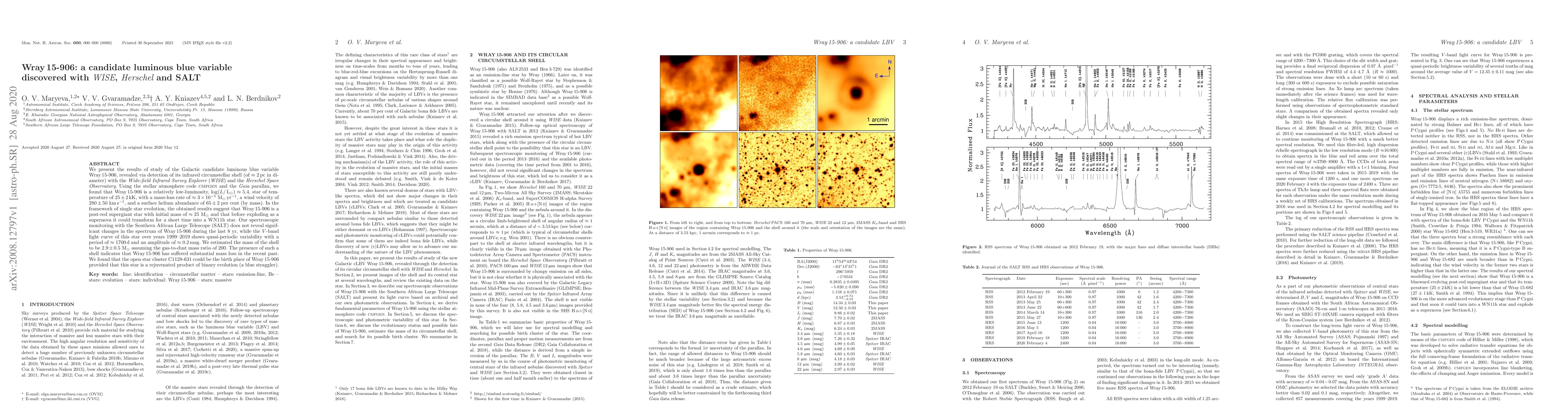 We present the results of study of the Galactic candidate luminous blue variable Wray 15-906, revealed via detection of its infrared circumstellar shell (of \approx2 pc in diameter) with the Wide-field Infrared Survey Explorer and the Herschel Space Observatory. Using the stellar atmosphere code CMFGEN and the Gaia parallax, we found that Wray 15-906 is a relatively low-luminosity, log(L/Lsun)\approx5.4, star of temperature of 25\pm2 kK, with a mass-loss rate of \approx3\times10^{-5} Msun/yr, a wind velocity of 280\pm50 km/s, and a surface helium abundance of 65\pm2 per cent (by mass). In the framework of single star evolution, the obtained results suggest that Wray 15-906 is a post-red supergiant star with initial mass of \approx26\pm2 Msun and that before exploding as a supernova it could transform for a short time into a WN11h star. Our spectroscopic monitoring with the Southern African Large Telescope (SALT) does not reveal significant changes in the spectrum of Wray 15-906 during the last 8 yr, while the V-band light curve of this star over years 1999--2019 shows quasi-periodic variability with a period of \approx1700 d and an amplitude of \approx0.1 mag. We estimated the mass of the shell to be 2.9\pm0.5 Msun assuming the gas-to-dust mass ratio of 200. The presence of such a shell indicates that Wray 15-906 has suffered substantial mass loss in the recent past. We found that the open star cluster C1128-631 could be the birth place of Wray 15-906 provided that this star is a rejuvenated product of binary evolution (a blue straggler).