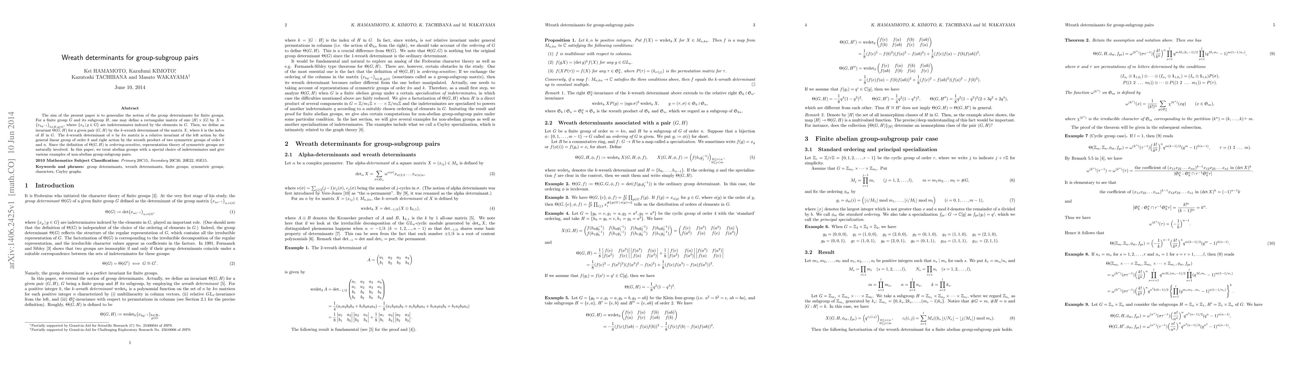 The aim of the present paper is to generalize the notion of the group determinants for finite groups. For a finite group $G$ of order $kn$ and its subgroup $H$ of order $n$, one may define an $n$ by $kn$ matrix $X=(x_{hg^{-1}})_{h\in H,g\in G}$, where $x_g$ ($g\in G$) are indeterminates indexed by the elements in $G$. Then, we define an invariant $\Theta(G,H)$ for a given pair $(G,H)$ by the $k$-wreath determinant of the matrix $X$, where $k$ is the index of $H$ in $G$. The $k$-wreath determinant of $n$ by $kn$ matrix is a relative invariant of the left action by the general linear group of order $k$ and right action by the wreath product of two symmetric groups of order $k$ and $n$. Since the definition of $\Theta(G,H)$ is ordering-sensitive, representation theory of symmetric groups are naturally involved. In this paper, we treat abelian groups with a special choice of indeterminates and give various examples of non-abelian group-subgroup pairs.