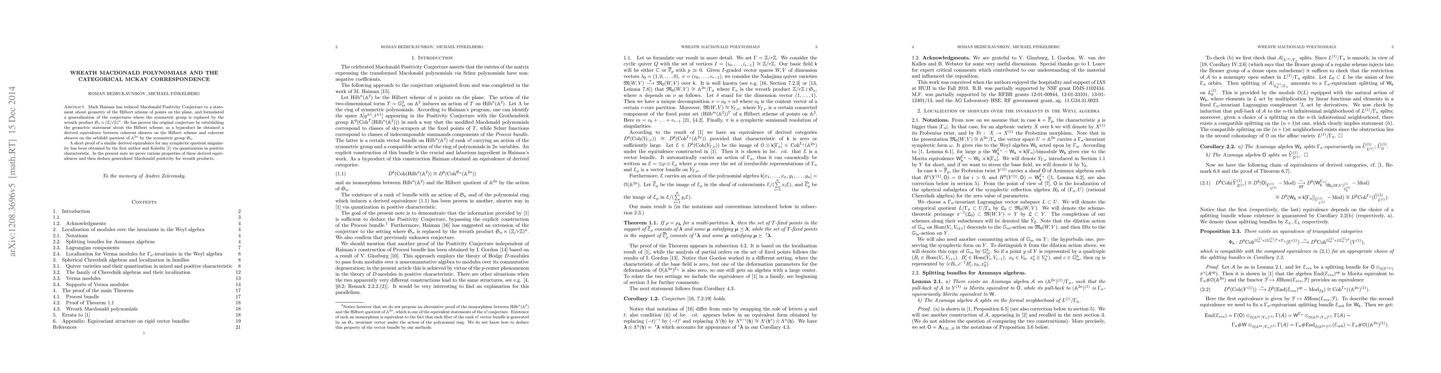 Mark Haiman has reduced Macdonald positivity conjecture to a statement about geometry of the Hilbert scheme of points on the plane, and formulated a generalization of the conjectures where the symmetric group is replaced by the wreath product $S_n\ltimes (Z/r Z)^n$. He has proven the original conjecture by establishing the geometric statement about the Hilbert scheme, as a byproduct he obtained a derived equivalence between coherent sheaves on the Hilbert scheme and coherent sheaves on the orbifold quotient of ${\mathbb A}^{2n}$ by the symmetric group $S_n$. A short proof of a similar derived equivalence for any symplectic quotient singularity has been obtained by the first author and Kaledin via quantization in positive characteristic. In the present note we show the properties of the derived equivalence which imply the generalized Macdonald positivity for wreath products.