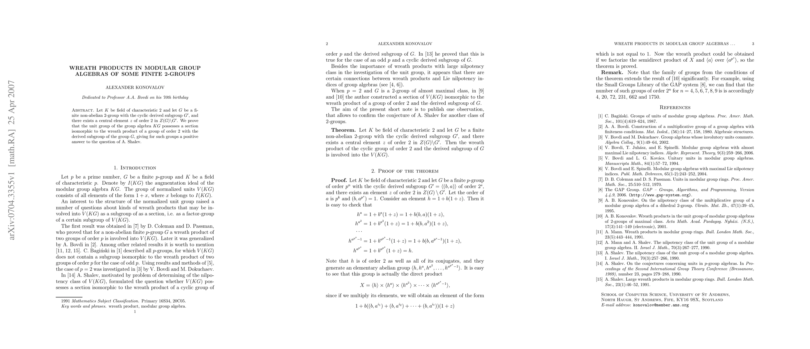 Let $K$ be field of characteristic 2 and let $G$ be a finite non-abelian 2-group with the cyclic derived subgroup $G'$, and there exists a central element $z$ of order 2 in $Z(G) \backslash G'$. We prove that the unit group of the group algebra $KG$ possesses a section isomorphic to the wreath product of a group of order 2 with the derived subgroup of the group $G$, giving for such groups a positive answer to the question of A. Shalev.