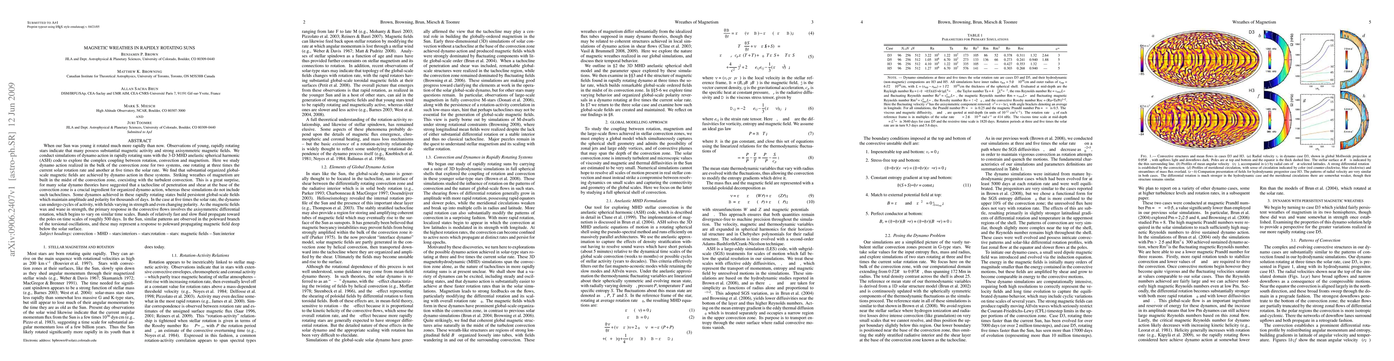 This study uses 3D MHD anelastic spherical harmonic simulations to explore dynamo action in rapidly rotating suns, finding that organized global-scale magnetic fields, resembling 'wreathes', form within the convection zone, challenging traditional dynamo theories that require a tachocline. These magnetic fields can persist for thousands of days and exhibit cyclical behavior in some cases, with associated variations in differential rotation.