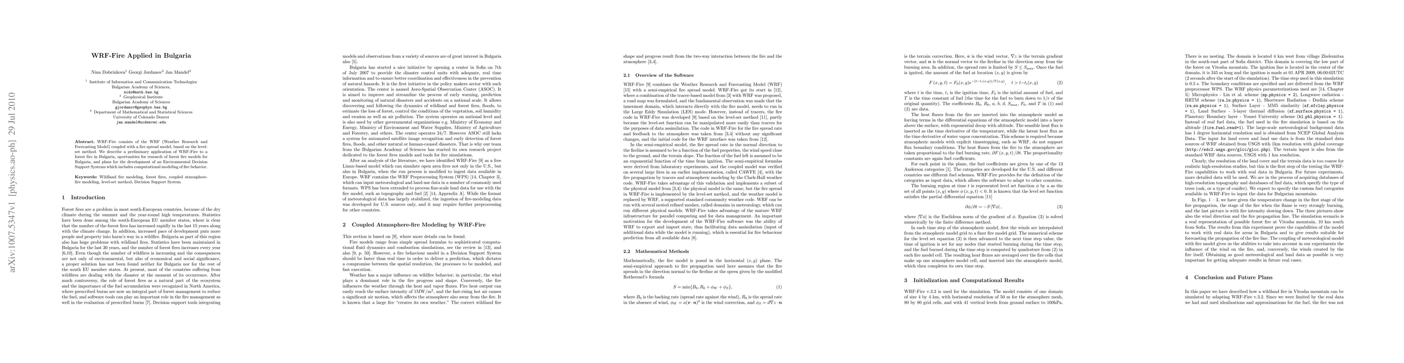 WRF-Fire consists of the WRF (Weather Research and Forecasting Model) coupled with a fire spread model, based on the level-set method. We describe a preliminary application of WRF-Fire to a forest fire in Bulgaria, oportunities for research of forest fire models for Bulgaria, and plans for the development of an Environmental Decision Support Systems which includes computational modeling of fire behavior.
