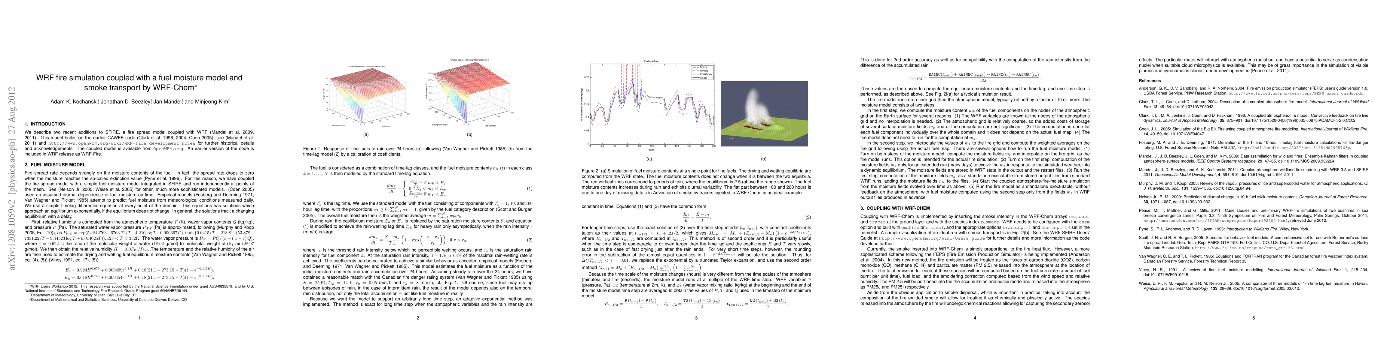 This paper introduces enhancements to the WRF model for simulating wildfire spread, including a fuel moisture model and smoke transport via WRF-Chem. The fuel moisture model uses an equilibrium time-lag approach driven by WRF atmospheric variables, and the fire model integrates smoke tracers into WRF-Chem for emission transport.