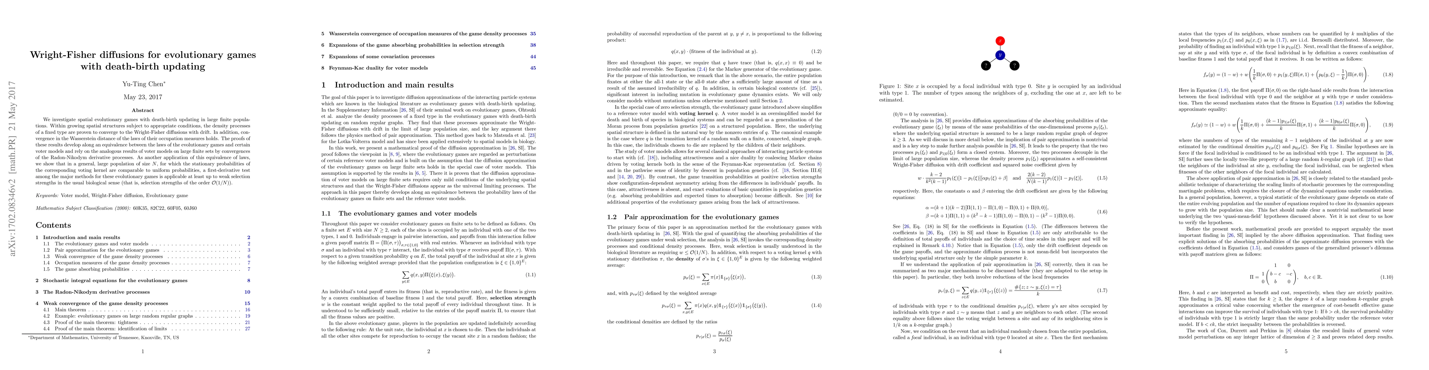 We investigate spatial evolutionary games with death-birth updating in large finite populations. Within growing spatial structures subject to appropriate conditions, the density processes of a fixed type are proven to converge to the Wright-Fisher diffusions with drift. In addition, convergence in the Wasserstein distance of the laws of their occupation measures holds. The proofs of these results develop along an equivalence between the laws of the evolutionary games and certain voter models and rely on the analogous results of voter models on large finite sets by convergences of the Radon-Nikodym derivative processes. As another application of this equivalence of laws, we show that in a general, large population of size $N$, for which the stationary probabilities of the corresponding voting kernel are comparable to uniform probabilities, a first-derivative test among the major methods for these evolutionary games is applicable at least up to weak selection strengths in the usual biological sense (that is, selection strengths of the order $\mathcal O(1/N)$).